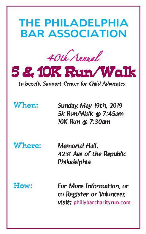 Since the first Bar Run in 1979, this event has attracted more than 1,300 runners and walkers of all ages each year, and is one of the oldest and most respected events of its kind in the City of Philadelphia! The Run/Walk format provides the opportunity for athletes of all levels to participate in this charity event organized by the Philadelphia Bar Association to spotlight its concern for the children of Philadelphia and to benefit the Support Center for Child Advocates. People of all ages will enjoy fun, family-friendly activities including the Buchanan Ingersoll & Rooney Kids Dash, the Caesar Rivise Team Competition, Face Painting, Balloon Animals and more!
