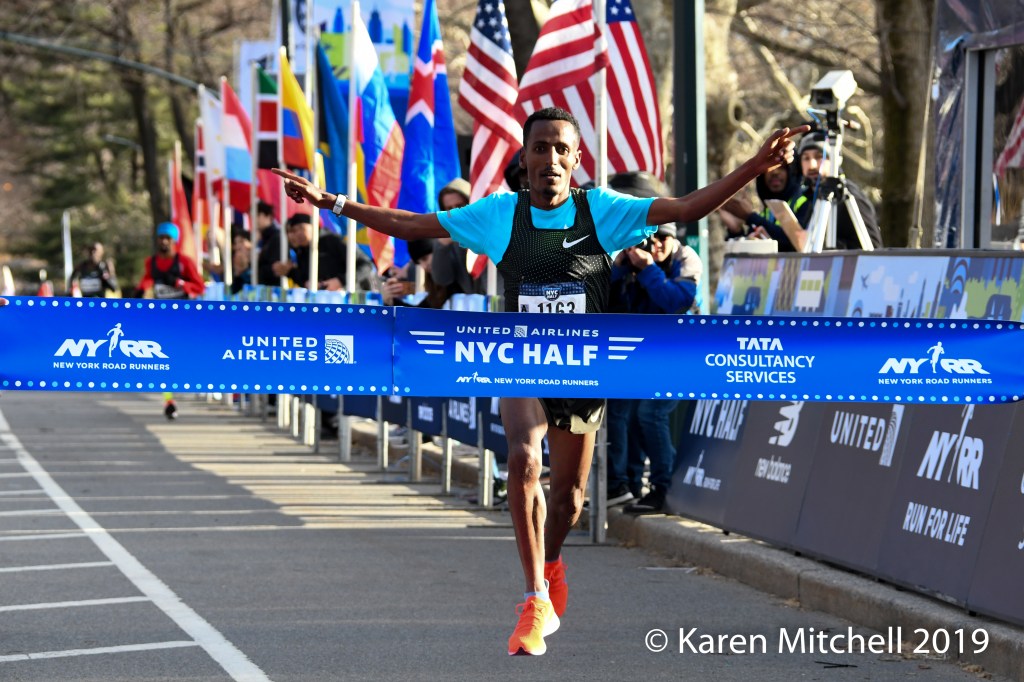 NEW YORK, NY, MARCH 17, 2019—Belay Tilahun, wearing bib #1163 was the surprise winner of the United Airlines New York City Half Marathon in 1:02:10. Tilahun, from Ethiopia’s capital of Addis Ababa, was registered by the West Side Runners, and started just behind the professional field with the A wave. Tilahun, was not a complete unknown, as he won the Bix 7 in Davenport, Iowa this past summer. Tilahun also won the prestigious Sao Silverstere 15K in Sao Paulo, Brazil on December 31. The 23-year-old Tilahun says he trains with Leul Gebresilase who won the Valencia Marathon in 2:04:31. His future plans include a half-marathon in China, making the World Champs 2019 Ethiopian team in the 10,000 meters, and he hopes to run the NYC Marathon in the fall.