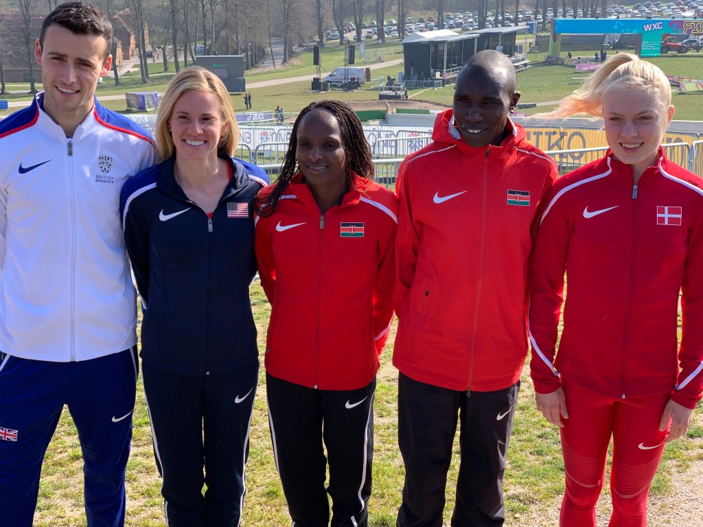 Adam Hickey (GBR), Courtney Frerichs (USA), Hellen Obiri (KEN), Geoffrey Kamworor (KEN), and Anna-Emile Moller (DEN). Photo by Karen Mitchell.