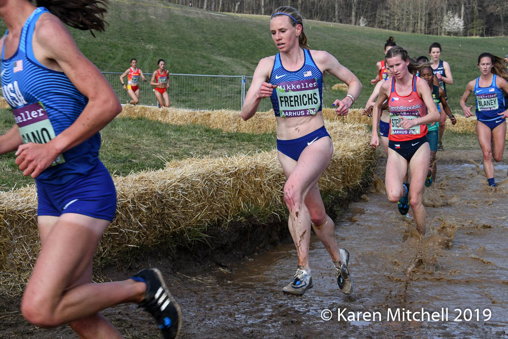 Stephanie Bruce of USA, a veteran of two World XCs, heads through the mud just ahead of three USA teammates. Dolshi Tesfu of Eritrea placed 38th and Emily Brichacek of Australia placed 35th.