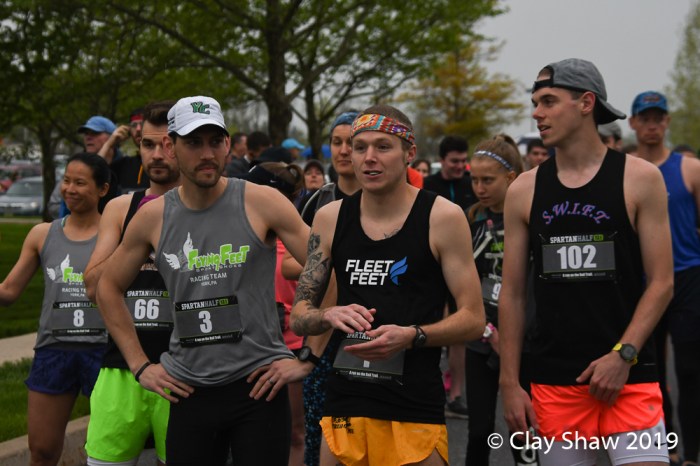 Andrew Friesema #3, Alexander Hampel #1, and Zach Lofties #102 at the start line of the Spartan Half Marathon. The three would be the podium placers at the end.