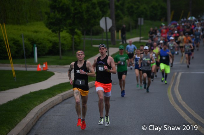 Alex Hampel #1 starts fast in quest of his third straight Spartan Half Marathon win. Zach Lofties of York, PA. hung tough to place second.