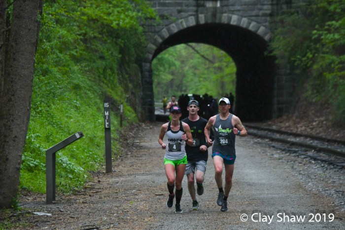 Megan DiGregorio of Baltimore running top master Pete LoBianco #204 just south of the Howard Tunnel, in the pouring rain.