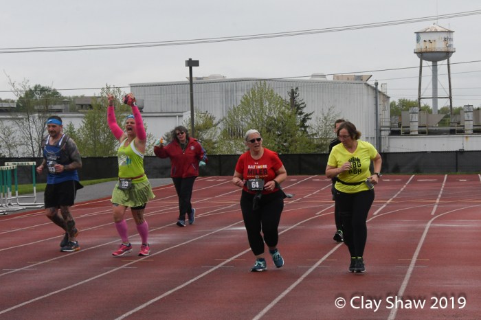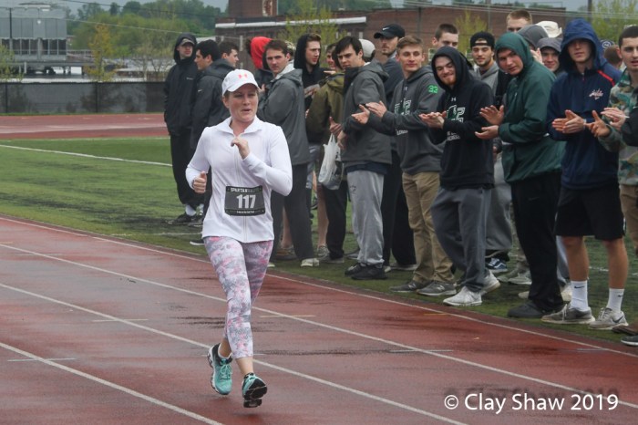 Karen Lam-Duckett of York, PA is the third overall female, and gets the cheers of York College student athletes.
