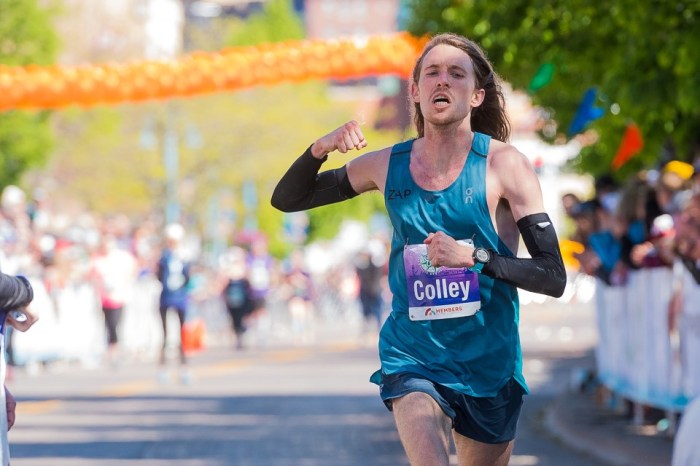 In the men’s race ZAP athlete Andrew Colley, 28 of Blowing Rock, NC, nearly caught Kenyan Boniface Kongin, 29, who established a substantial lead early, running course-record pace alone until he began getting cramps in his calves and struggled mightily, relinquishing most of his lead, but held off a gaining Colley 2:12:01 to 2:12:15. Colley told me at the finish that he was cramping badly and could not have run any faster.