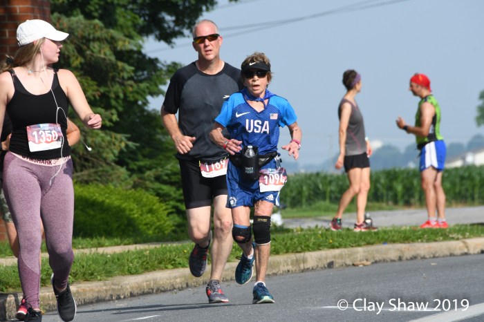 Georganne Watson of Lititz won the women’s division easily in 31:38, with just six men ahead of her. Former PA resident Vicki Boyer of Grants Pass, Oregon was second in 34:53, and top Master, despite missing two months of training while coaching track in Oregon. Kelly Dworak of Carlisle, at age 57, was third overall in 37:16, just ahead of Mardiny Ung of Elizabethtown (age 52) in 37:33. Most of the Masters (all but one over 45) rocked the results. The remarkable Heidi Moebius, at age 80 ran 49:06. Heidi had recently represented the USA in the Masters Track World Championships in Torun, Poland. Heidi told me that she had arrived in Torun, but her luggage had not, Heidi smartly packed essential racing gear in her carry-on. 172 runners completed the 5 miler, which also had a companion 5K run/walk.