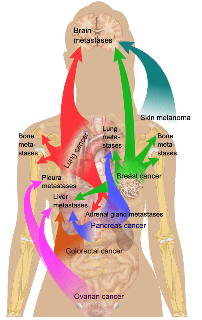 When abnormal cells move a distance from the primary cancer site to another part of the body, those cells are known as a secondary malignant growth. Figure A shows the sites of metastases for common cancer types except for prostate cancer. This abnormal growth in the prostate solely occurs in males. If and when cancer cells exit the prostate gland they usually metastasize (spread) to the bones. https://commons.wikimedia.org/wiki/File:Metastasis_sites_for_common_cancers.svg#/media/File:Metastasis_sites_for_common_cancers.svg