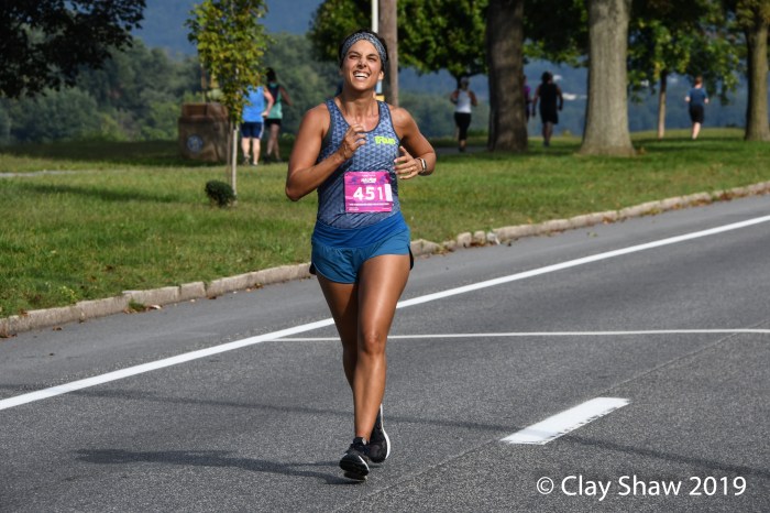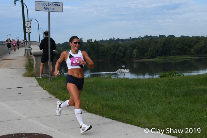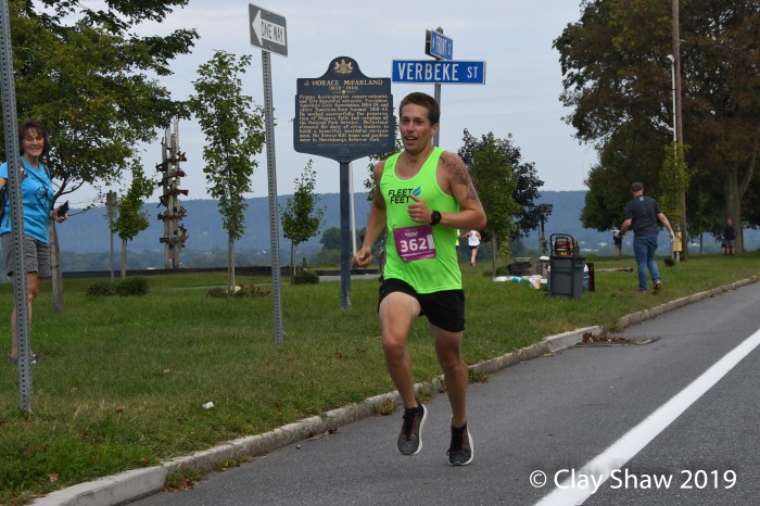 HARRISBURG, PA, SEPTEMBER 8, 2019—Fred Joslyn of Mt Holly Springs, PA., who has battled lingering hamstring injuries for the past three years, sailed to a 1:11:52 victory at the Harrisburg Half Marathon. Fred was quite pleased with how he felt, so much so that he even took the fireball shot on the home-stretch toward the finish. The course now features three bridge crossings, and runs entirely on the top level along the Susquehanna River, with an awesome finish straightaway on Front Street. The cooler weather was also a factor in many runners running PRs.