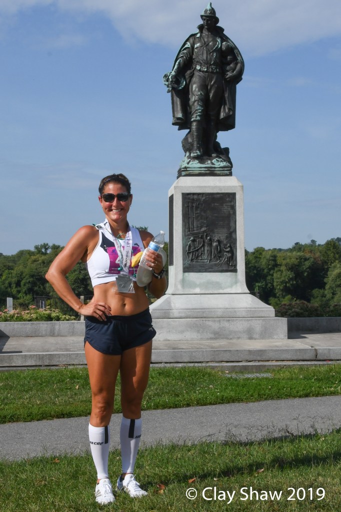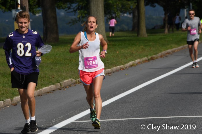 Bailey Drewes, was only topped by the first four men. In a Google search, Drewes has an Olympic marathon qualifier. Her hometown is listed as Bemidji, Minnesota, and more recently Ithaca, NY. She entered the race late, and no hometown was listed. Regardless, she dominated the women’s race by winning by over four minutes, in 1:20:17. Baltimore gals Meaghan Murray (1:24:59), and Lizzie Royer (1:27:06) took the other two podium spots with great times. Shelby Joslyn (Fred’s wife, but you knew that) was fourth in 1:29:41, as she prepares for the Chicago Marathon. Jen Esposito of Kutztown, PA was fifth and top Master in 1:30:42.