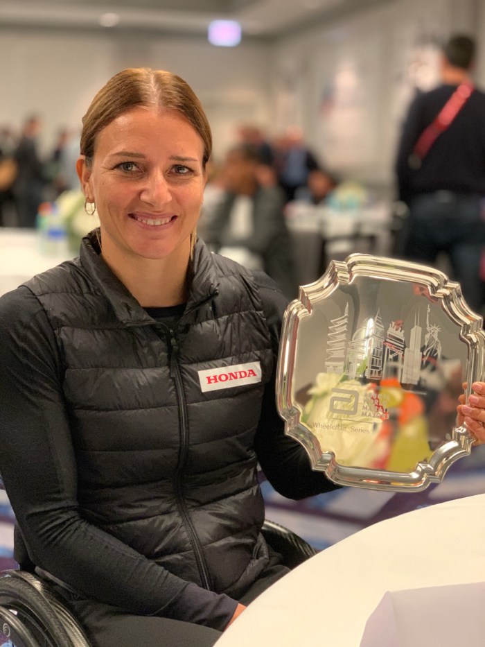 Tatyana McFadden and Sarah Sellers, all set for Chicago. Tatyana is a most celebrated athlete, having won 22 Abbott World Marathon Majors in just 11 years of elite marathon racing. She has won Chicago Marathon eight times! (Photo by Karen Mitchell)