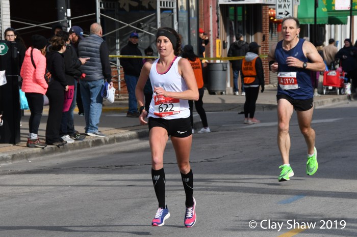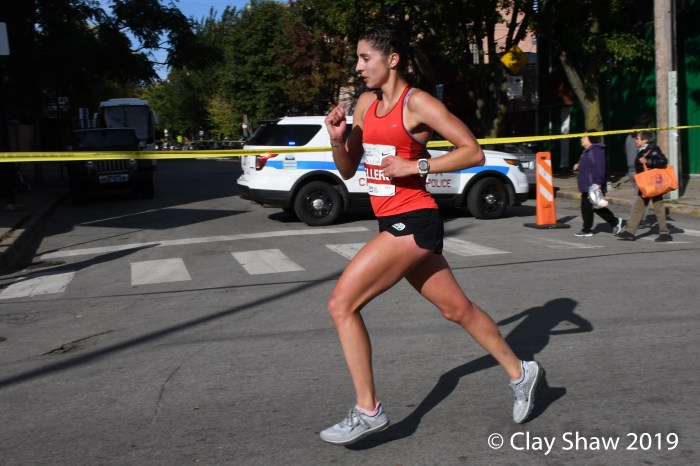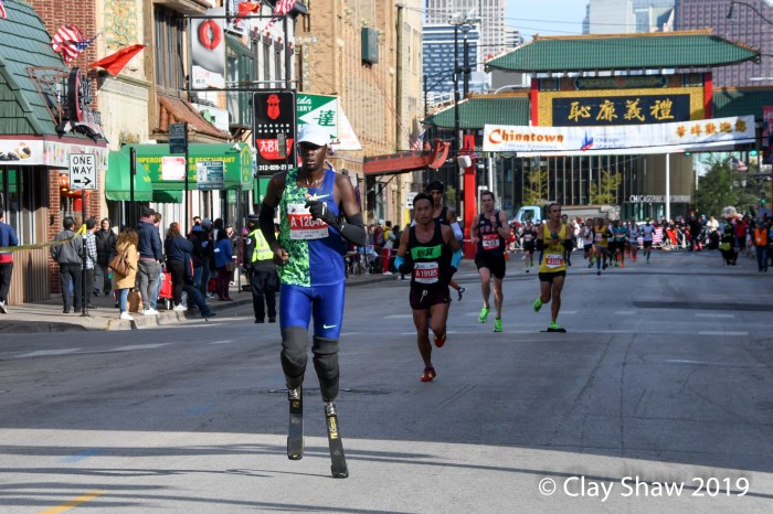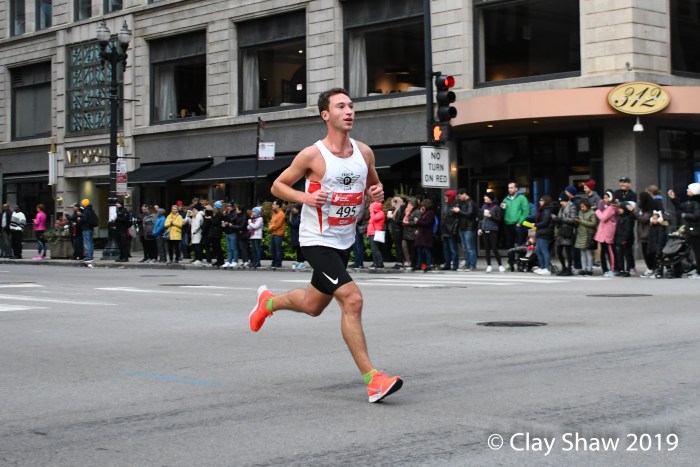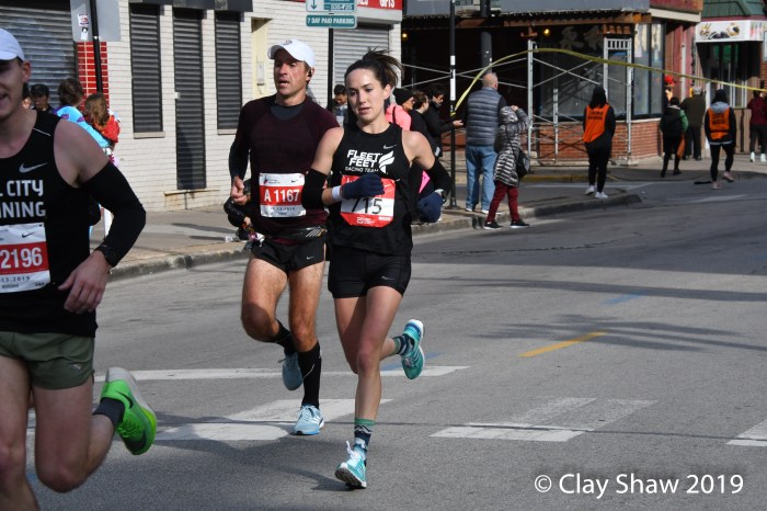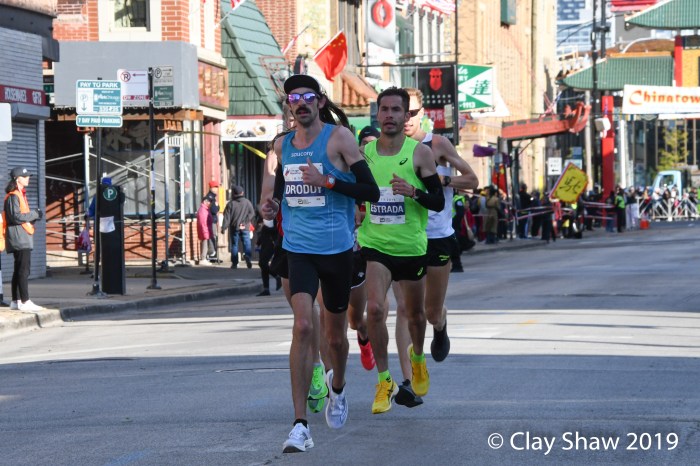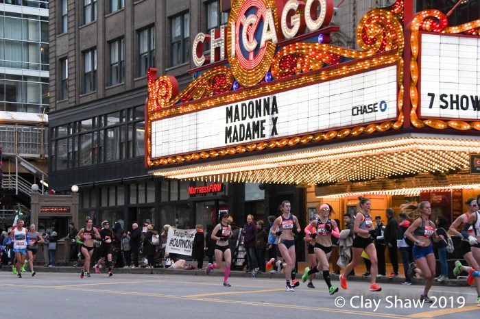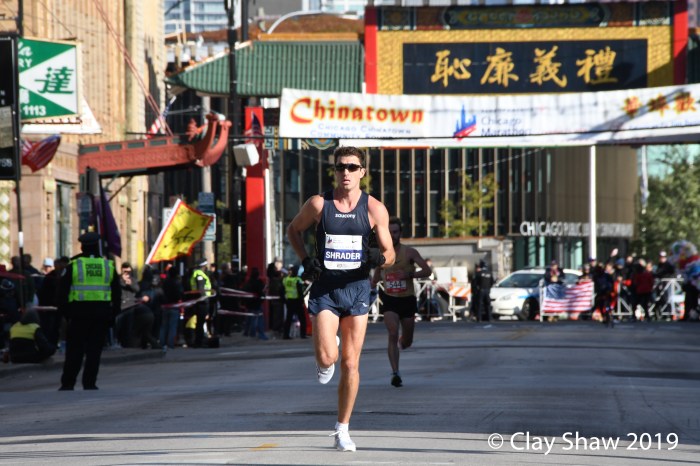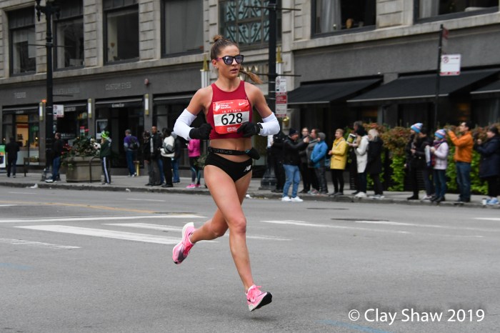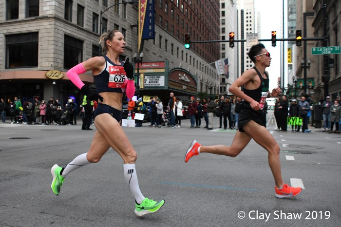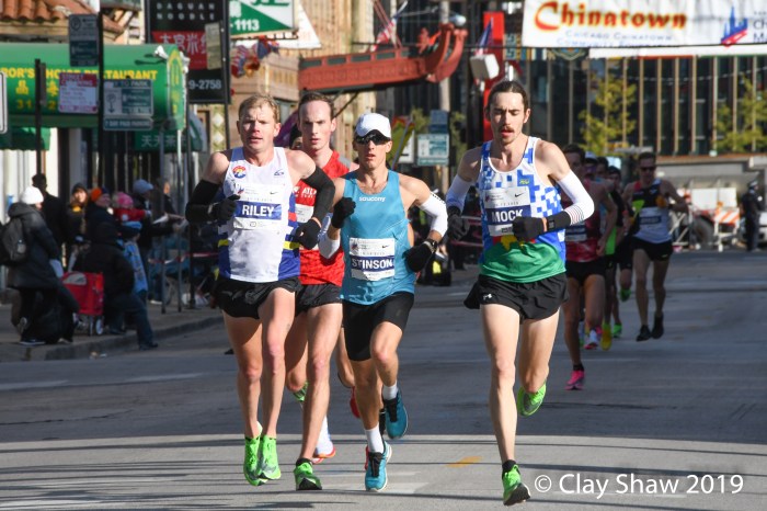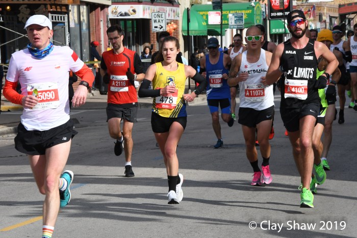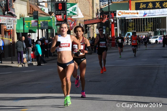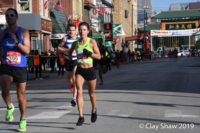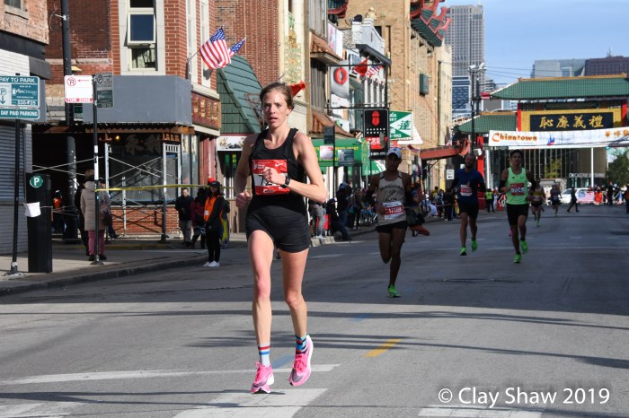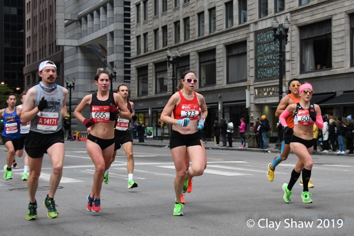 USA women hoping for an OQ, pass the Chicago Theater on State Street.Matthew Herzig of Philadelphia runs an OQ of 2:17:01 to place 36th.Top USA women’s pack with Emma Bates, Lindsay Flanagan, Stephanie Bruce. Steph’s husband Ben Bruce is the official pacer.Gina Rouse of Knoxville, Tennessee strides up LaSalle. Rouse would finish 23rd in 2:38:44.Kerri Ruffo of Hampton runs an OQ of 2:43:35 placing 49th.Joanna Thompson 666 of Blowing Rock, NC (44th, 2:43:01) and Caroline Bauer of Elkridge, Maryland (56th, 2:4407) run OQ times.Jacob Riley, Matt McDonald, Parker Stinson, and Jerrell Mock all USA sprint through Chinatown Chicago near Mile 22.Jacob Riley of Boulder lead USA men with a 2:10:36. Jerrell Mock of Fort Collins was 2nd USA in 2:10:37. Scott Smith of Flagstaff, AZ was 6th USA in 2:11:14 and Parker Stinson of Boulder was 3rd USA in 2:10:53.Noah Droddy of Boulder and Diego Estrada of Flagstaff, AZ both on their way to new personal bests. Droddy 17th in 2:11:42 and Estrada in 19th with a 2:11:54.Brian Schrader of Brighton, Massachusetts runs 2:13:27 to place 22nd in the deep Chicago Marathon field.World Record Form: Brigid Kosgei sets new women’s marathon record of 2:14:04 in Chicago.Emma Bates of Boise, Idaho (now Emma Ulmer) is first USA woman and 4th overall with a new PR of 2:25:27.Taylor Ward of Ogden, Utah on way to PR of 2:30:14, to finish 10th. Madai Perez of Mexico ran 2:31:44 for 11th.Sarah Sellers of Tucson, AZ on way to personal best of 2:31:49, to place 12th overall and 6th USA.Mia Behm of Brooklyn, NY finished 15th in 2:33:52 and 7th USA. She sure deserves a “name on bib” next race.Lindsey Anderson of Twins Falls, Idaho placed 17th in 2:35:28 and was 9th USA.Julia Roman-Duval of Columbia, Maryland finished in 19th with a new PR of 2:35:41.Marko Cheseto of Orlando, FL sets a new blade record of 2:37:23.Jane Bareikis of Crestwood, IL on way to a 2:37:32, good for 22nd place.Karen Dunn of Trappe, PA finished 55th and 3rd AG with an OQ of 2:43:59. Moira O’Connor Lenth of Seattle was just four seconds ahead in 54th.Julia Buford of San Francisco runs an OQ of 2:44:24.Carter Norbo of Charlottesville, VA runs 2:45:38 placing 60th in the women’s field.David Ho of Sweden and Cecil Reid of South Africa lead group through Chinatown. Ho ran 2:47:49 and Reid 2:46:05.Anna Li of San Francisco runs 2:48:25 in Chicago Marathon with SF Giants shirt.Jen Rock of Macomb, Mississippi finished in 2:48:30.Kate Gunson of Chicago (and BAA top) runs 2:52:18.Chinatown Chicago