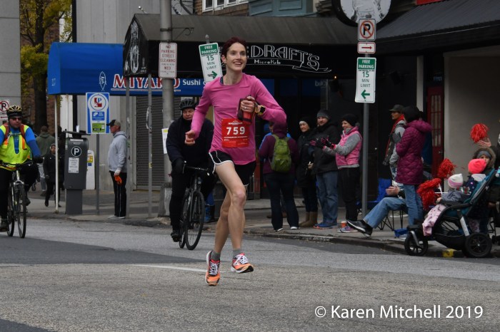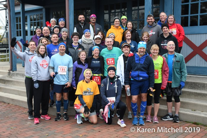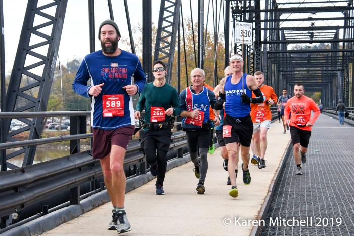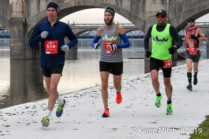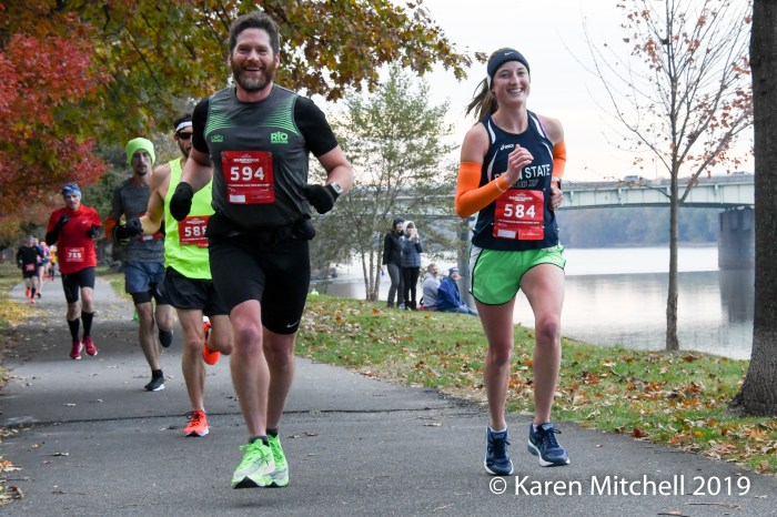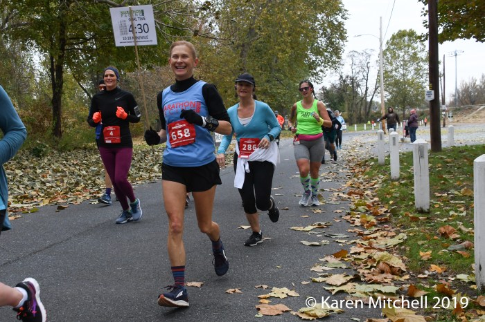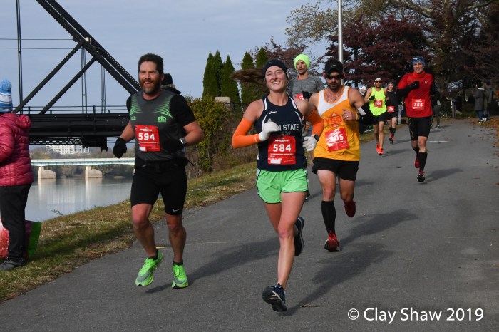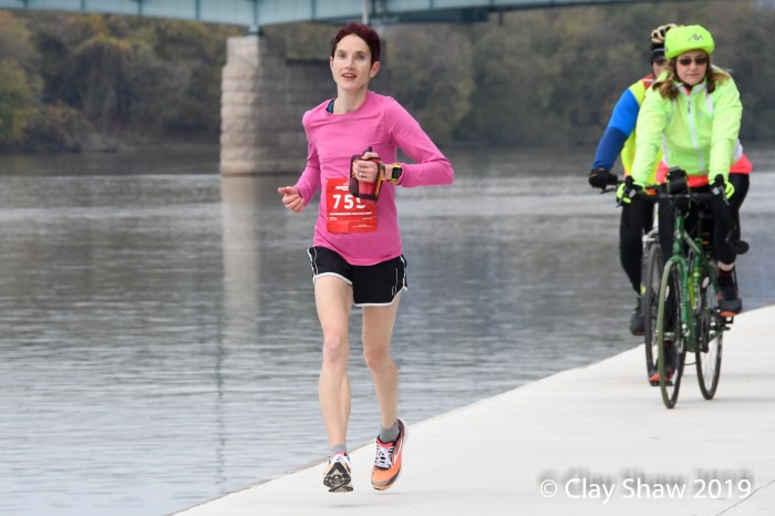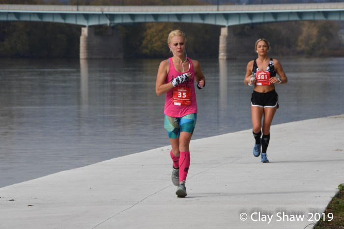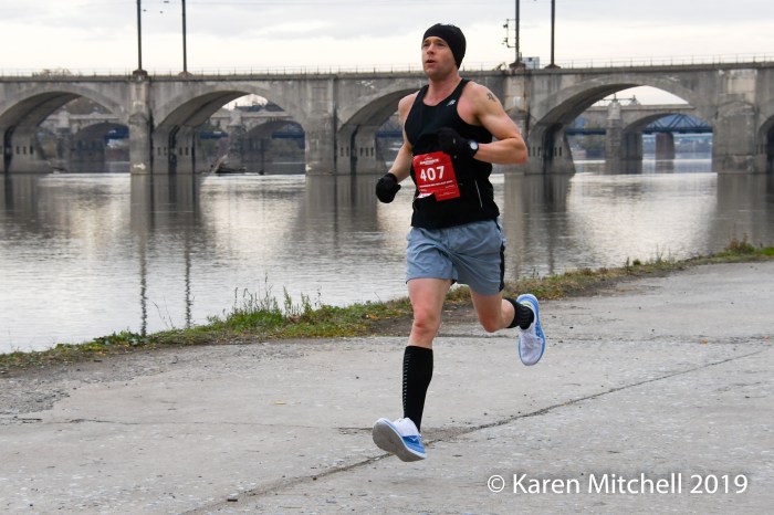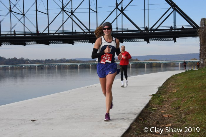 River Runners group photograph prior to the 2019 Harrisburg Marathon.Start photo of 2019 Harrisburg Marathon on Market Street Bridge above City Island.Greg Johnson and Fred Joslyn share the early lead along the Susquehanna. Both former champs of the Harrisburg Marathon, Joslyn would win 2019.Noah Reighard #602 of Boiling Springs, PA runs with Brett Shelley of Blacksburg, VA, and Joe Phifer #567 of Alexandria, VA. All three men placed in the top six. A.J. Kelly of Altoona placed third overall in 2:36:49.York runners Eric Wolfgang (center) and Josh Jamison #386 run along the newly paved lower level along Susquehanna River. Tadd Morris #514 of Pittsburgh shares the pacing. Wolfgang placed 10th overall. Jamison was 14th and 3rd master, Morris was 33rd.Roberto Rivera-Vazquez of York placed 42nd in 3:11:23. Marc-Andre Charette of Gatineau, Quebec (CAN) was 39th in 3:10:12.Pete Mulligan of Baltimore leads the 4:40 group on the downhill to the Susquehanna.Joe Phifer of Alexandria ran a solid maraton to place second in 2:36:45. Luis Miranda of Lebanon, PA, lowered his PR to 2:38:11 and finished fourth overall.Mike Ravegum of York enjoys another marathon and the company of Amy Puleo of State College. Mike finished 22nd in 3:02:57; Puleo was second woman overall in 3:07:02.Keith Straw of Malvern, PA leads the 3:35 pace group. Chris Blosenski #44 of Lititz, Jonas Stoltzfus of Holtwood, PA #711, and Rob Kole #421 of Carlisle form the happy group at Mile 10.Pacer Matthew Wisner of Montville, NJ leads a group to just under 3:40. They are crossing the Walnut Street Bridge between miles 10 and 11.Shawn Rairigh #589 of Camp Hill, PA and Evan Earl #266 with Derek Somerville #696 and the 3:30 pace group.Katherine Shank leads a pace group that includes Betsy Alderman #4 of Champaign, IL, Leemarie Fisher #286 of Camp Hill, PA, and Emily Melton of New Cumberland, PA. Athletes Serving Athletes group on City Island. Jennie Bowman #52 and Lindsay Papachristou #551 of Hummelstown, PA smile for the camera on the back of the City Island loop.Don Halke in signature pink running with Carrie King #414 of Edinboro, PA.Pete Mulligan #522 leads the 4:40 pace group.Mike Ravegum #594 and Amy Puleo #584 run on the ramp from the Walnut St Br to the path along the river. Ravegum finished 22nd overall and Puleo finished 2nd woman.Lacey Wallace of State College is on fast cruise control nearing Mile 25, as she won in 2:56:22.Rayanne Luke of Newark, Delaware in final mile, as she placed 10th in 3:26:00.Julie Bengyak of Croton-On-Hudson, NY in final mile of Harrisburg Marathon. Lindsay Pridgen of Mechanicsburg, who had a PR, gives chase. Beth Treas of Northumberland, PA gives a thumbs-up on way to 3:34:40.Fred Joslyn of Mt Holly Springs on way to victory, nearing Mile 26.Harrisburg Marathon River Runners signed and delivered this banner to a strategic spot along the course.Miles of smiles and a sub 3 for women’s champ Lacey Wallace of State College, PA, who won in 2:56:22.Mike Ravegum of York charges to the finish line in 3:02:57, good for 22nd place. Amy Puleo of State College finishes second overall in 3:07:02.