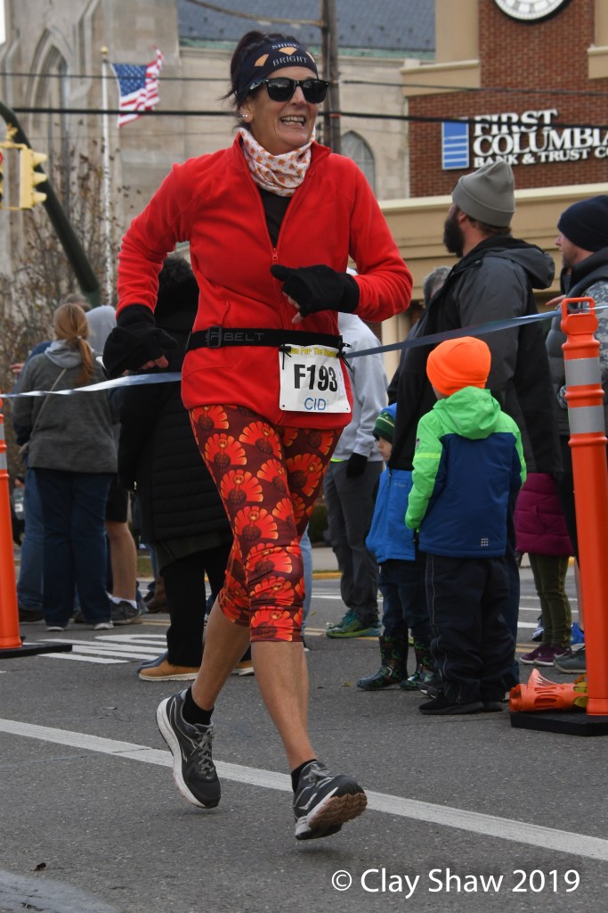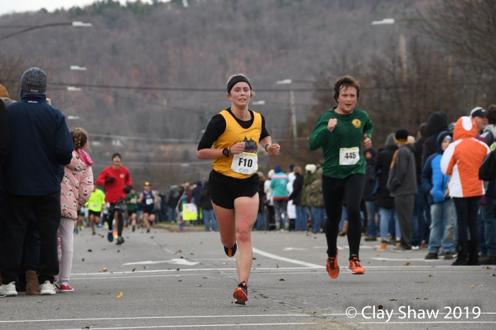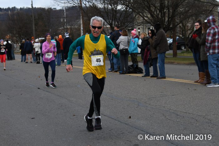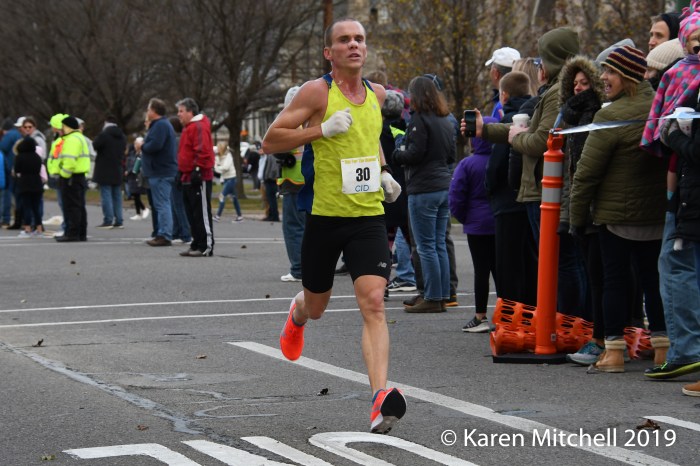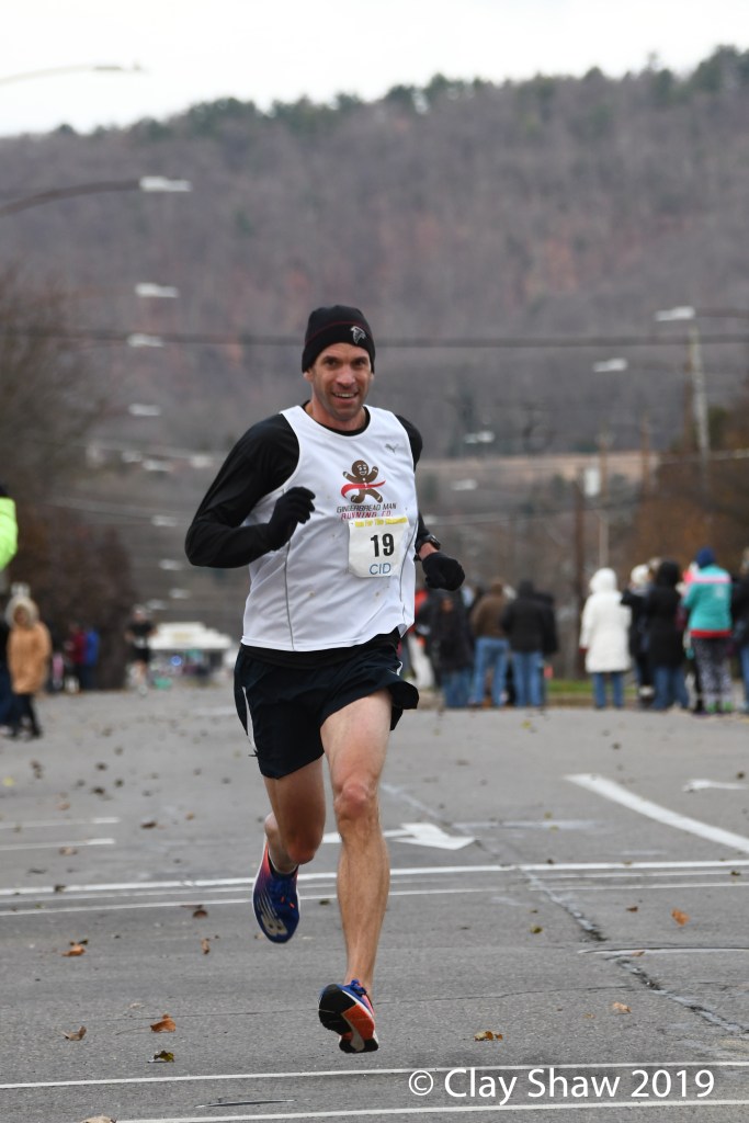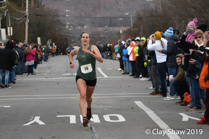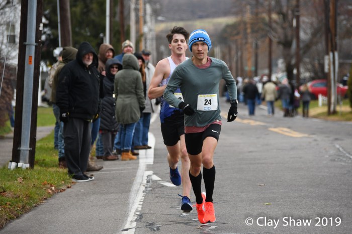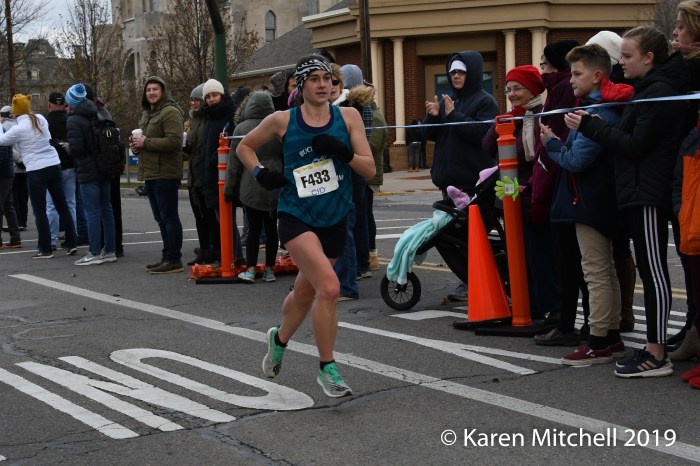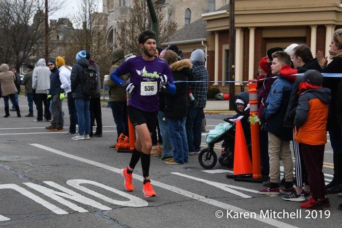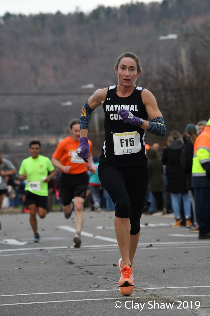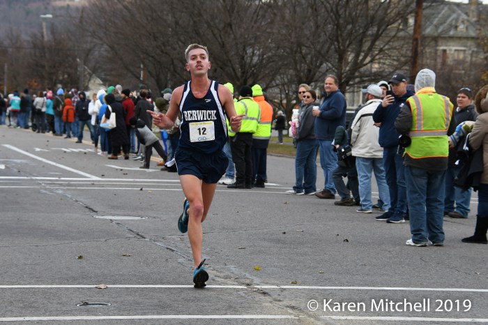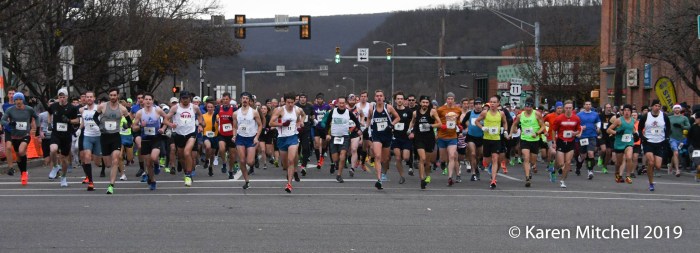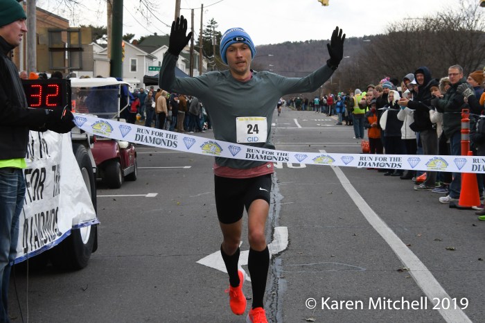 Berwick, PA, November 26, 2019—No Berwick male runner has won the Run for the Diamonds since 1908, the first year it was held. Dylan Gearinger wanted to change history, had a great start, and led the first three miles to the top of Summerhill. Suddenly Gearinger grabbed his right leg and was out of the race. It was a sudden and very sad end to the Berwick native’s race. Gearinger had just run a 23:51 in the Rothman 8K in Philadelphia the previous Saturday. Colin Leak, a 2:14 marathoner from Chadds Ford, PA, took over the lead and was later challenged for several miles by Alex Price of Bethlehem. With a mile to go Leak surged on Market street, and set up his 46:13 winning time. Alex Price finished 15 seconds later in 46:48. Trevor Conde (AKA Trevor Van Ackeren) of Easton was third in 47:09. Paul Thistle of Capitol Heights, MD, the 2013 champ, was fourth in 48:03.