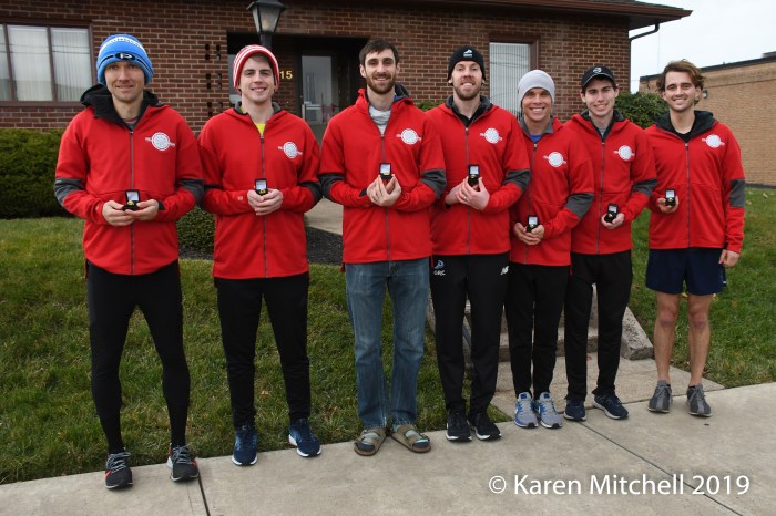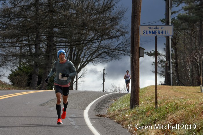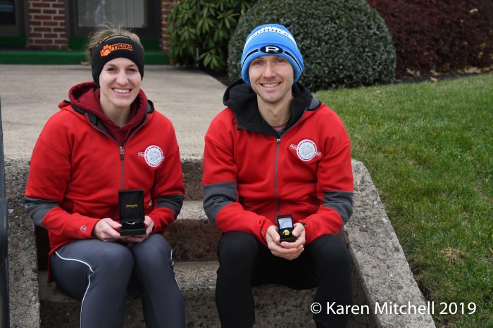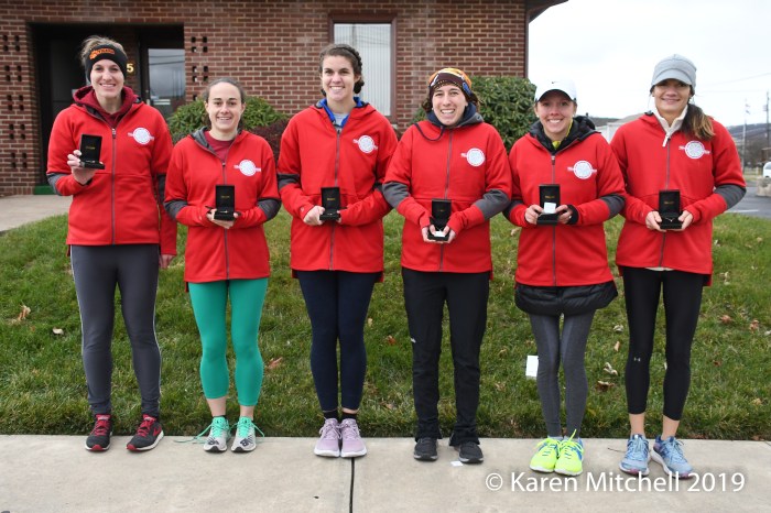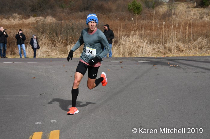 Marina Martino of Dallas, PA won the Run For the Diamonds for the second time with a 54:43. In 2015 she won as Marina Orrson. Rosie Moscoli of Wayne, PA, a regular in the top seven women, was second in 55:43. Emily Shertzer of Jonestown, PA, who turned 40 on November 19, was third in 56:09. Shertzer earned double diamonds as first 40’s athlete and third overall. Clare Schoon of Scranton was third in 56:29. Katherine Sick of Millville, PA was fifth in 56:43. Karaleigh Foster of Knoxville, TN was sixth in 57:30. Foster won four times, 2012-14, and again in 2017. Her 2014 win set the course record of 50:33. Whitney Heydenreich of Danville took the final diamond in 58:17. Laura Yoder of Fleetwood, PA won the 50’s diamond in 1:08:48. Kate Fisher of Watsontown, PA was the 60’s winner in 1:10:34.