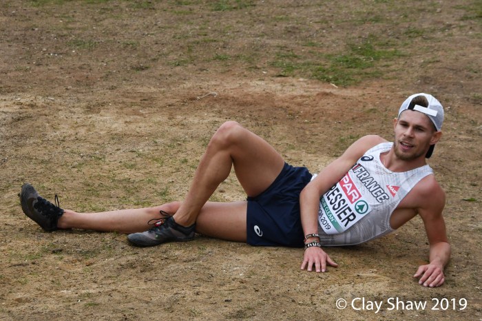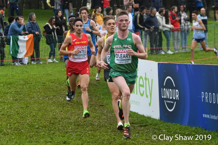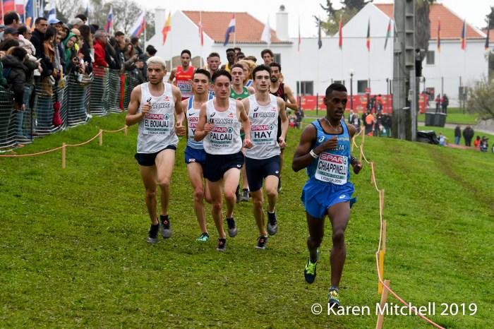 LISBON, PORTUGAL, European Athletics SPAR Cross Country Championships, DECEMBER 8, 2019—Jimmy Gressier of France put the hammer down on the final lap, which gave him the opportunity to celebrate on the home stretch. Gressier won in 24:17, and it could have been faster if not for the celebrations, capped off by a glamour pose for the press photographers. Elzan Bibic of Serbia finished second in 24:25, after doing much leading throughout the race, Abdessmad Oukhelfen of Spain earned the bronze in 24:34. France, led by Gressier, won the team title. Fabien Palcau finished sixth and Mohamed-Amine El Bouajaji finished tenth to score for France. Italy took second, Germany was third.