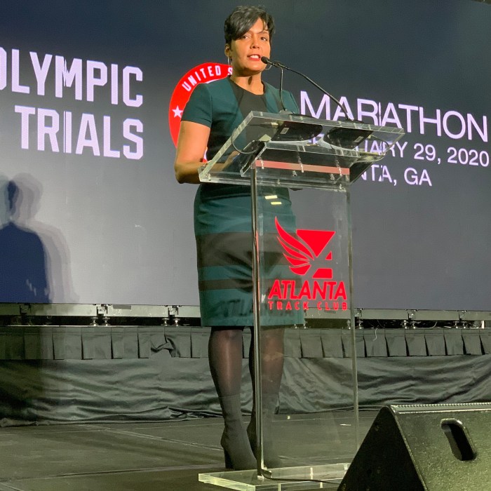 ATLANTA, GA, FEBRUARY 27, 2020—-At a well-attended press conference, Atlanta Mayor Keisha Lance Bottoms addressed the media saying that as she’s traveled the world, she has found there are three things Atlanta is known for by Internationals: Martin Luther King Jr, “Gone with the Wind,” and the 1996 Atlanta Olympics. She is proud that the Olympic Trials will again showcase their beautiful city, and will be celebrated around the world.