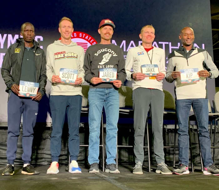 Jacob Riley of Boulder, CO had a 2:10:36 PB in Chicago 2019, after missing nearly three years due to numerous injuries. His advice to the high school students was perseverance, having a good support system despite setbacks, and never giving up. Bernard Lagat, 45, of Tucson, AZ had a 2:12:10 OQ and PB at the Gold Coast Marathon in Australia in only his second marathon. A five-time Olympian (2000 and 2004 for Kenya and 2008 and 2016 for USA). Lagat thinks his track experience and his newness at the marathon may pay off for a sixth Olympic team.