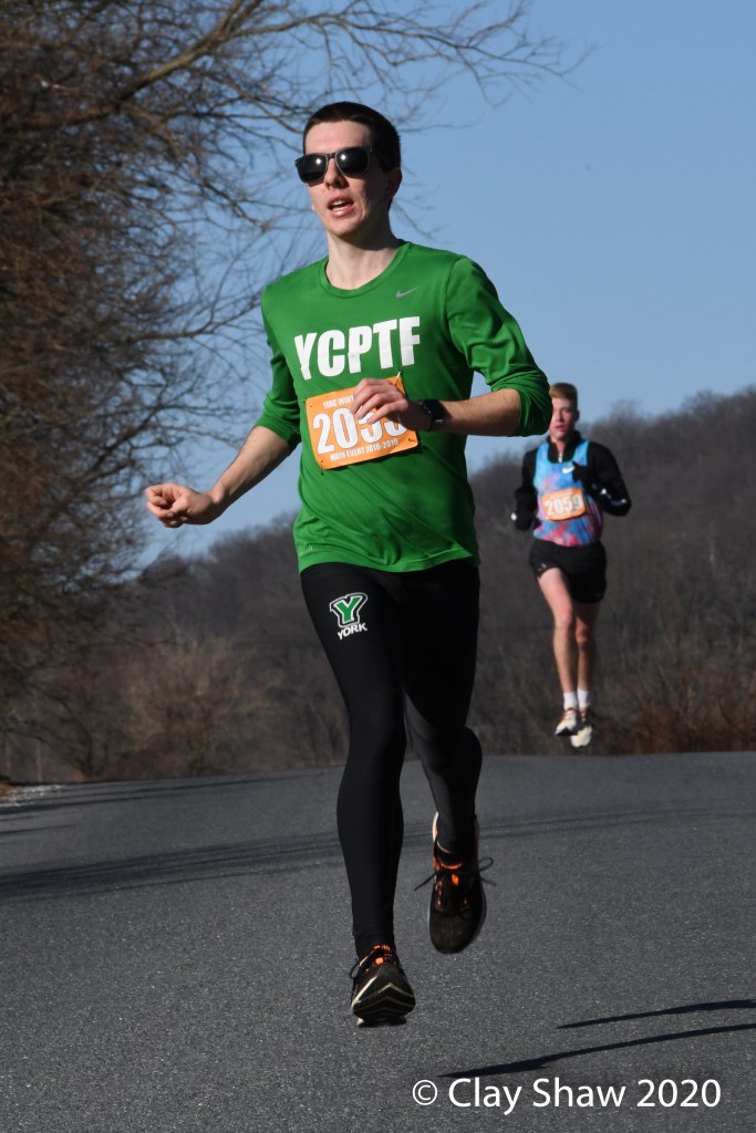 YORK, PA, FEBRUARY 22, 2020—Benjamin Linne of York won the Springettsbury 10K in 34:37, on the hilly course that borders the Rocky Ridge.