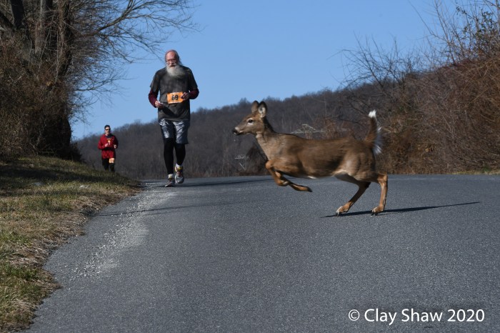 Stephanie Arnold of Gettysburg was the top woman and top master in 42:48. A herd of deer in the Hellam Township hills, startled by the 245-runner field, took off in reckless abandon, crossing the course twice in front of runner Dwight Dickensheets of Hanover. The deer were leaping, crashing through fencing, changing minds, and reversing course.