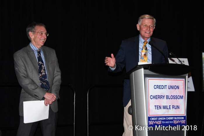Another thing that I’ll never forget was Phil not bringing me back to announce Cherry Blossom 10 Mile after a few years in the late ’80s of doing it. (The reason behind this will go undisclosed.) I loved doing it and was sad they didn’t want me anymore. We remained friends and colleagues in the sport for several more years until the fall leading to the upcoming 25th Anniversary, he called me and said “it was time to let you out of jail, and if you are willing to accept, you can be the announcer again!” The rest is history and I have been the announcer since that time. I believe it rivals the longest continuous announcing assignment I enjoy with the Walt Disney World Marathon!