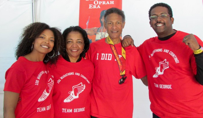 Team George family celebrates George’s 100th marathon at the 2014 Marine Corps Marathon. L-R Yvette, Bernadette, George and Andre’. George Jr. (not pictured).