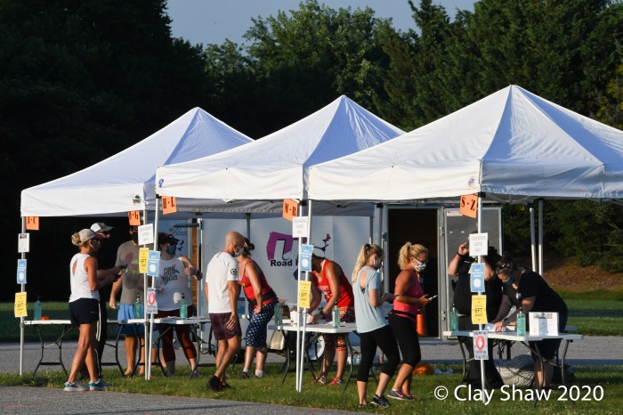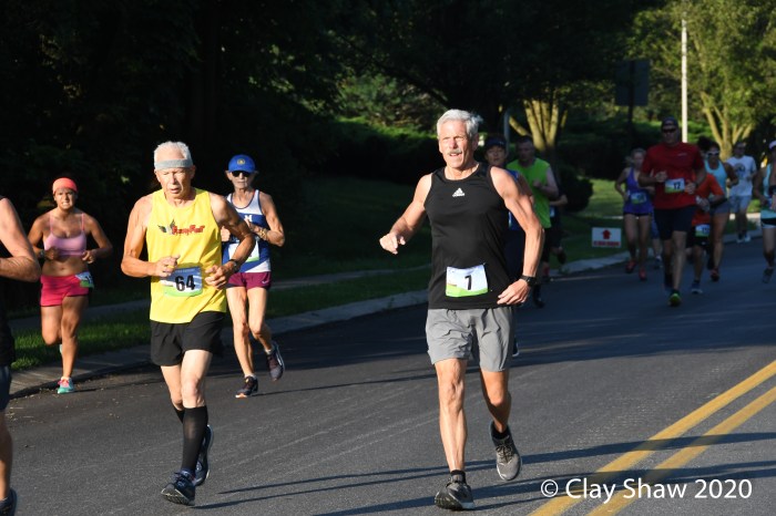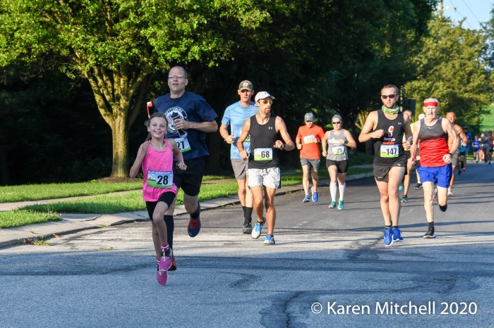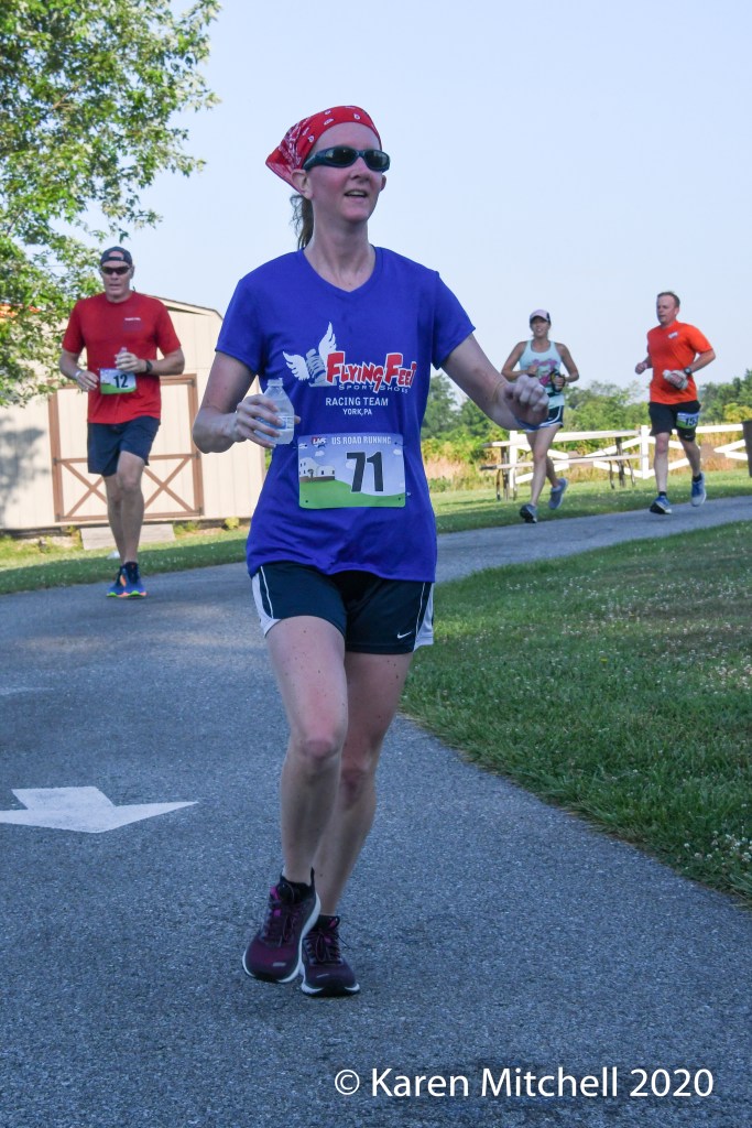 YORK, PA—The 8th Annual Shoe House 5 Miler, held July 4, 2020, became the first regional race to be held live since the start of the pandemic in mid-March. Race director Melissa Darrin had mixed emotions about going forward with the region’s first live race. The “Green” designation issued by the state of Pennsylvania for York County in early June made the event possible for less than 250 people (runners and staff). Guidelines for six-feet apart in either the packet pick-up line or the toilet lines. Masks were to be worn to pick up packets and at anytime other than the actual race itself. The water station was staffed by gloved personnel who placed 8 oz. unopened bottles of water on the tables. Throwaway containers were nearby. Awards will be mailed. 176 runners finished the 5 miler, and 191 registered.