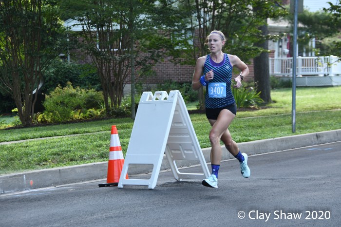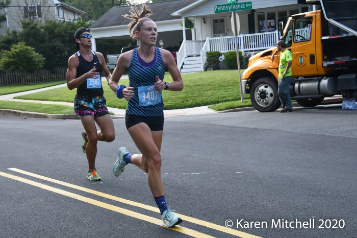 Megan DiGregorio has eyes on the finish as she tries to maintain social distance over male runner just past mile 3.