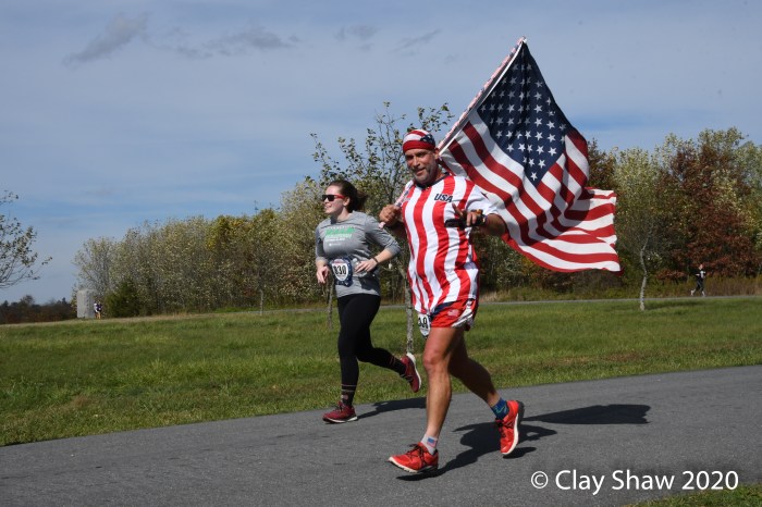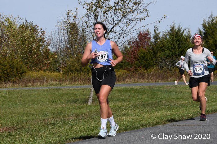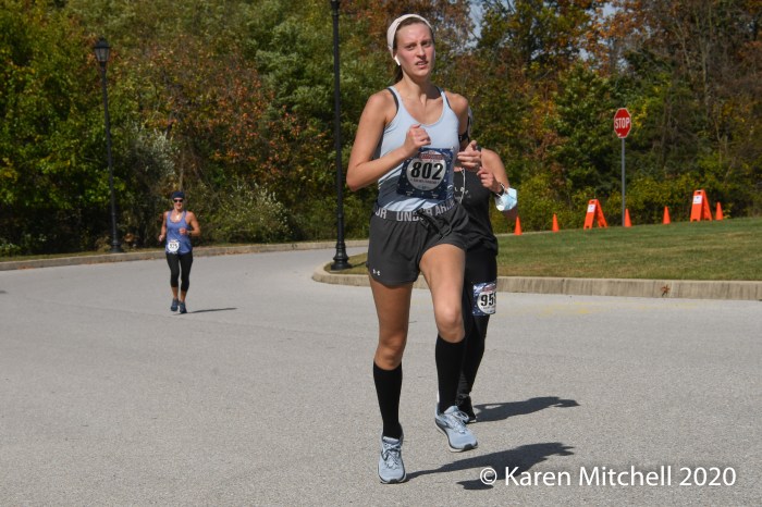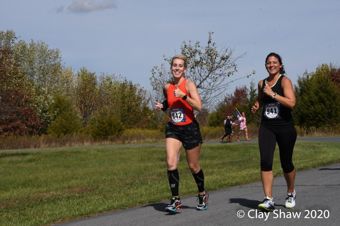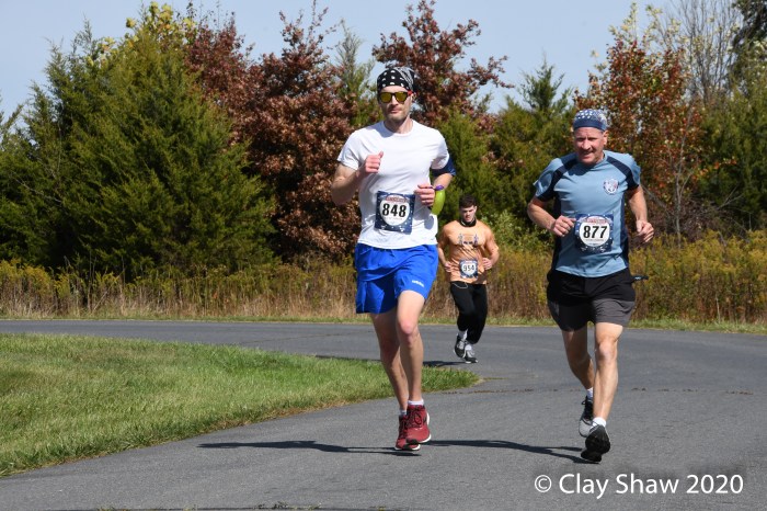 GETTYSBURG, PA, OCTOBER 17-18, 2020—More Pandemic race coverage; the Blue-Grey Half Marathon was staged on Sunday, October 18 in two parts, an 8am start and a noon start. The Gettysburg North-South Marathon took place Saturday, October 17. Karen and I did our own workouts in the morning and covered the afternoon running (when it was nicer). As it turned out, we only have pictures of one podium finisher—Shelby Joslyn, the 3rd place female of the combined results. 411 runners finished in the combined results.