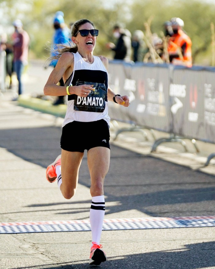 As Taylor was hurting, Keira D’Amato of Midlothian, VA was making up ground. At 35K Taylor was up nine seconds on D’Amato. By 40K D’Amato took over second place and finished with a massive personal best of 2:22:56. D’Amato’s splits were 1:11:40/1:11:16, a negative split. Taylor took third in 2:25:22 and Emma Bates of Idaho took fourth in 2:25:40, a PB. D’Amato, Bates, and Steph Bruce were running together for much of the first half of the race, but Bruce dropped out at 28km with plantar fasciitis issues. (Editor’s note: It Hurts!!)