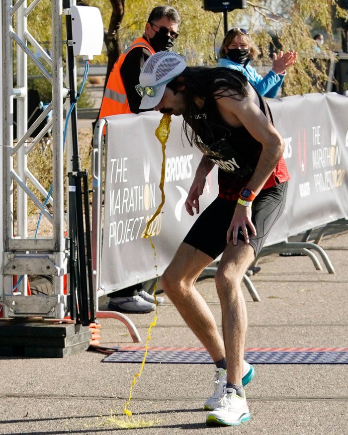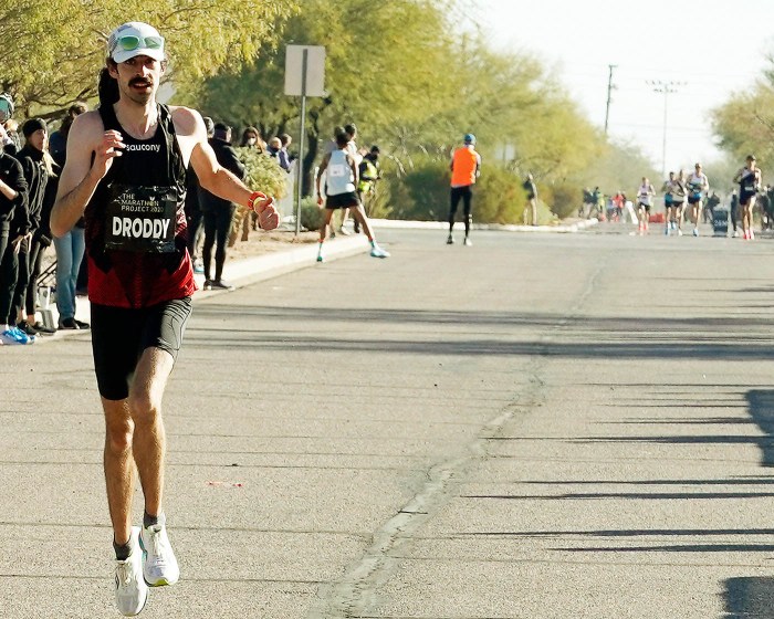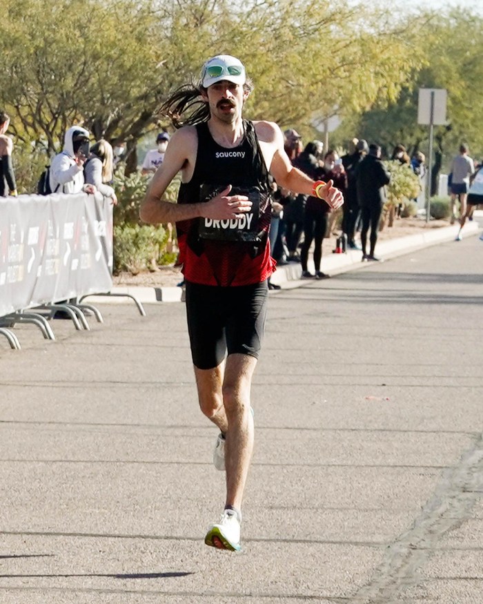 Noah Droddy finished second in 2:09:09, with a PB. Droddy seemed to be in the chase, but the gap just maintained, never closing. Droddy did “blow chow” upon finishing, on national TV. Droddy is now #9 on the USA All-Time List. Colin Bennie, who was Hehir’s teammate at Syracuse and now lives in Charlottesville, VA, took third in 2:09:39, a personal best. Scott Fauble of Flagstaff, AZ was fourth in 2:09:42. Ian Butler of Boulder was fifth in 2:09:45, another PB. Scott Smith of Flagstaff, AZ was sixth in 2:09:45, a PB. Mick Iacofano of the Idaho Distance Project, had a PB of 2:09:55 to place seventh. Seven USA men ran under 2:10 in the desert. Benjamin Preisner of Canada had a great 2:10:17 debut to finish eighth.