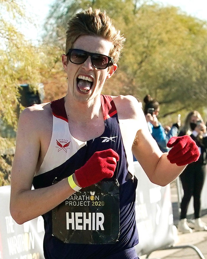 CHANDLER, AZ, DECEMBER 20, 2020—-Martin Hehir, a medical student in Philadelphia, ran almost exact splits to win The Marathon Project in Chandler, AZ with a two-and-a-half minute personal best of 2:08:59. Pacemakers Mason Ferlic and Frank Lara took a large pack through halfway in 1:04:27. Hehir’s splits were 1:04:29/1:04:30, nearly spot on. By 30K the pack was down to eleven, and gradually runners began to drop off the pace, leaving Hehir in front by ten seconds. Hehir said on the broadcast interview that he “started to fall apart in the last couple miles, but I was able to hold it together just enough.” Hehir now has the seventh (7th) fastest USA time.