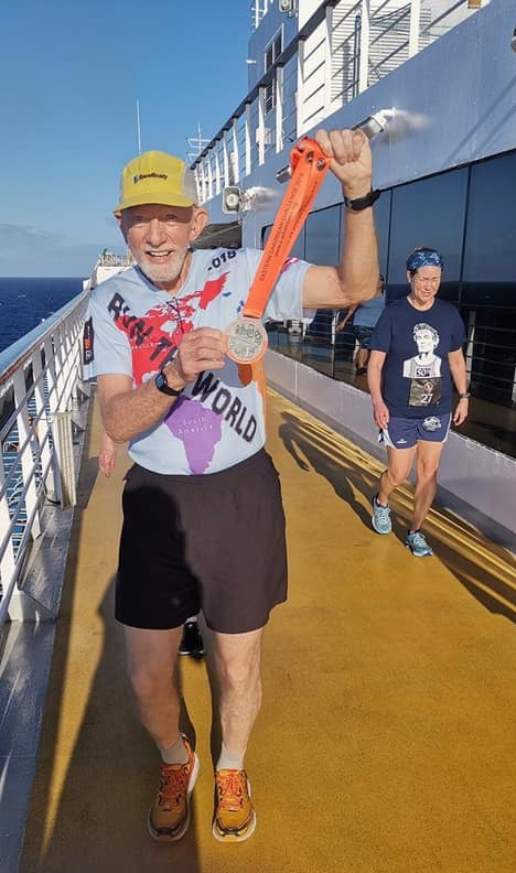 Now I am so chronologically gifted, it thrills me because many times I am not only first in the race in my division. but also last. One of my friends tells me that it’s called a cheap and hollow (or “CH”), because you don’t have to race anybody in particular. However, I always race myself. In 2017 I ran marathons or ultramarathons in 38 different countries. I was always traveling and taking care of my body. How this was possible is because I mix in a lot of cross-training. I would get a massage once a week, do pool running once a week, and lift weights. I was only running 15 to 20 miles a week and was racing whenever I had a chance. To this day I still race 5ks, 10ks, half-marathons, and other distances just to get out and race. I am not that keen on training, but I love racing.