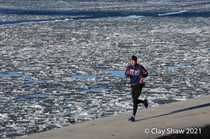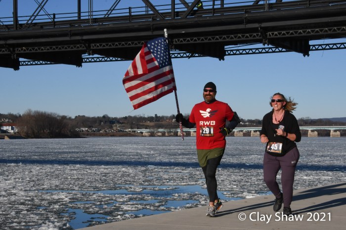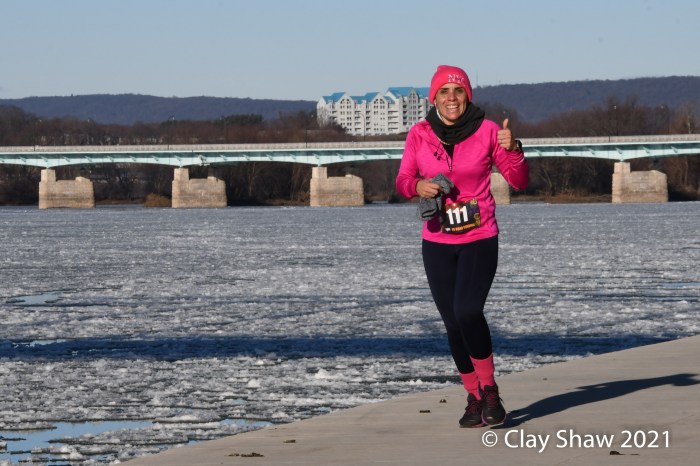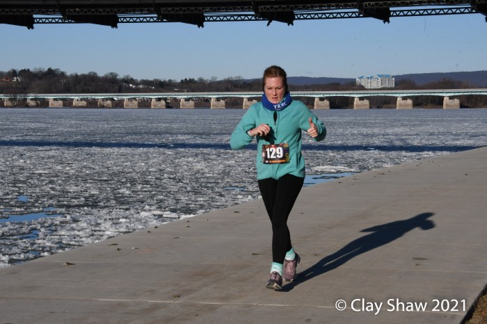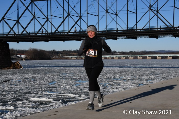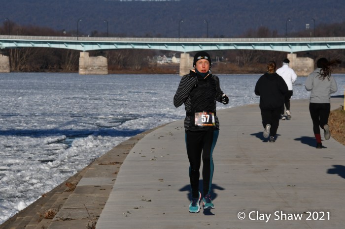 HARRISBURG, PA—The US Road Running 5K/10K New Year’s Day event, held January 30, 2021, happened 29 days late. Pennsylvania had limited outside gatherings to a maximum of 50 from mid-December through early January, in an attempt to slow COVID-19 cases. And then a big mid-December snowstorm, followed by a torrential all-day rain on Christmas Eve, led to the Susquehanna River flooding well over the lower running path that is used by most Harrisburg races. January 1, 2021 found most of the race course under the much fuller Susquehanna River.