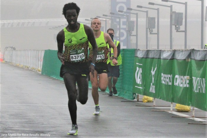 Abdisamed Abdi of Rochester Hills, MI outkicked his Hansons-Brooks teammate Zach Panning for the win. Abdi was credited with a 1:03:59 clocking, and Panning at 1:04:00, just one second back. They joked that they race in workouts quite often. Matt Llano of Flagstaff, AZ was third in 1:04:19. Last fall, Llano had COVID-19 with self-described mild symptoms, but his return to training was conservative and hard, and he’s only felt better in recent weeks.
