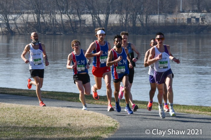 Lucky Charm 10K lead pack of regional elites race each other in the first mile, led by Josh Sadlock #257 of Harrisburg, who soon socially distanced the others and won the race in 31:51.