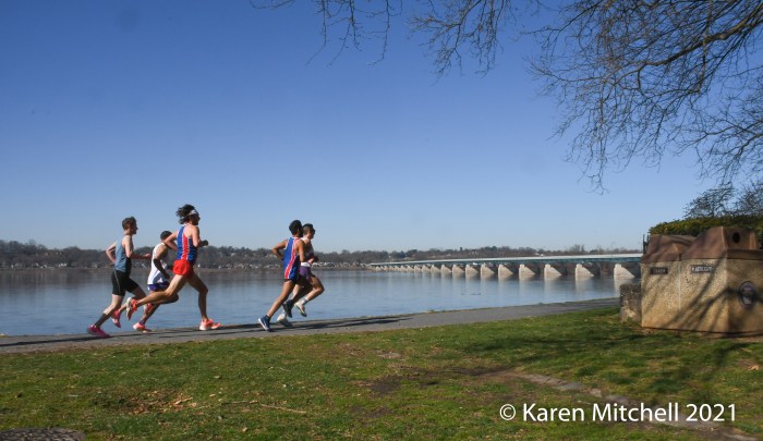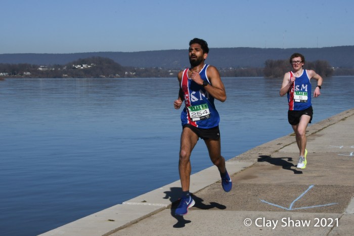 Nick Lachman of Lancaster leads teammate Nathaniel Alter of Lancaster, along the banks of the Susquehanna River. Lachman placed 2nd in 32:35. Alter was third in 32:46