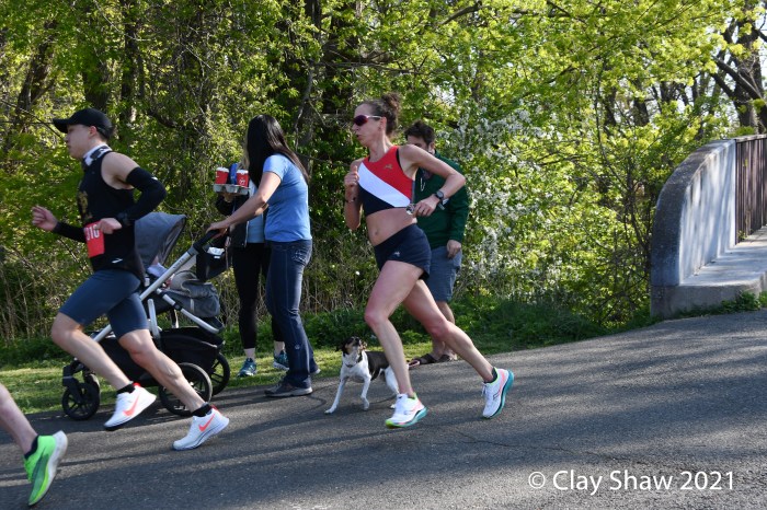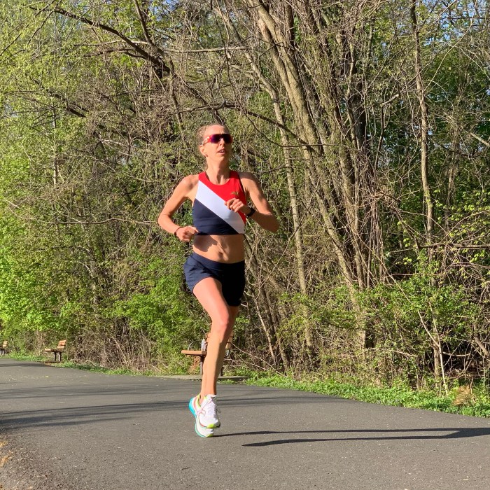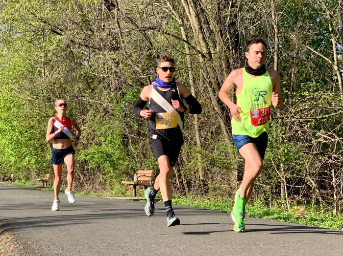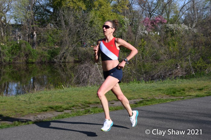 Saddle Brook, NJ, April 24, 2021—When US World Championship marathoner Roberta Groner needed a live marathon recently, she created her own. With help from Matt Slocum and Laura DeLea, she organized a live, certified marathon course on the Saddle River Park Trail. It was a five-lap route, each approximately five miles, with the remaining 1.2 miles added at the end. And it was a beautiful setting with a river, a lake and plenty of shade.
