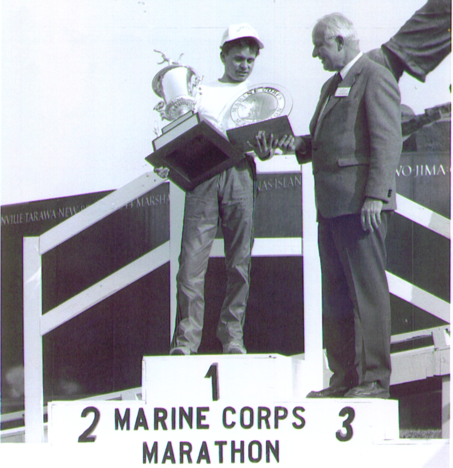 11-8-1987 Jeff Scuffins with Ambassador J. William Middendorf, II 12th Marine Corps Marathon, 1st Place, Event Record 2:14:01 (Photo Courtesy of Marine Corps Marathon)