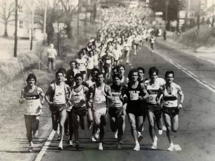 The 1987 St. Patty’s 10 Miler in Kutztown drew the stars of the Mid-Atlantic. Jeff Scuffins, third from left, won over this deep field that included Amway, Boreham, Reifsnyder, Barnhill, G.Beardsley, and Doub. (Photo by Clay Shaw)
