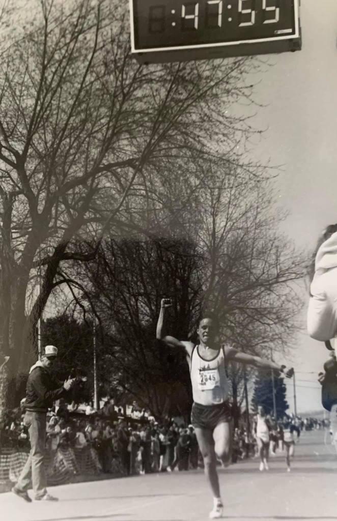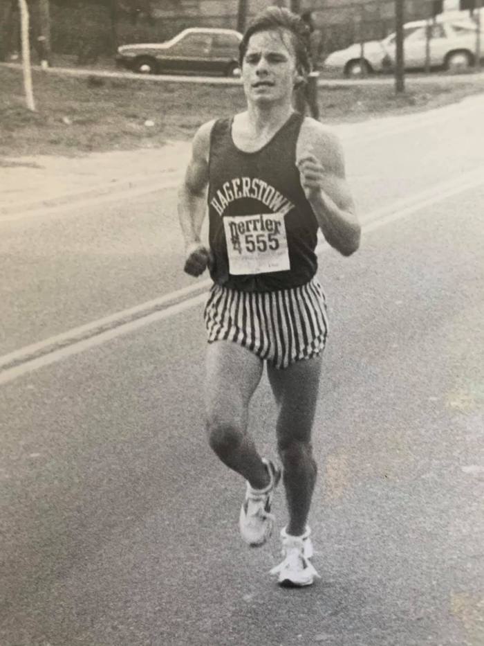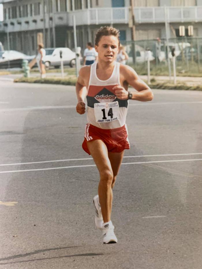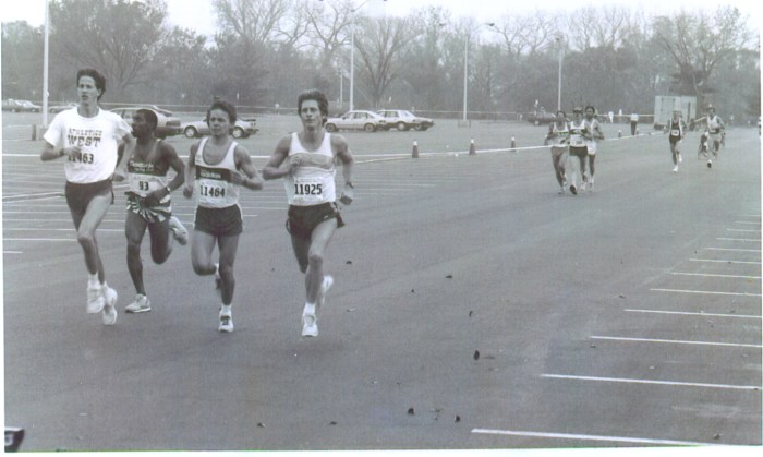 “The 1987 Marine Corps Marathon (MCM) was supposed to be a long 15ish mile tempo run preparing for an Olympic Trials Qualifying attempt at the Cal International Marathon the following month. Our coach Greg Shank got him a number so he could run in the MCM race. He just felt so good. Greg told him to keep going and go ahead and get his Olympic Trials Qualifying mark today. If you watch the race-coverage video, you can tell there was a lot more in the tank than 2:14:01 if he had needed it. He was entertaining—and funny guy—who everyone loved hanging out with.”