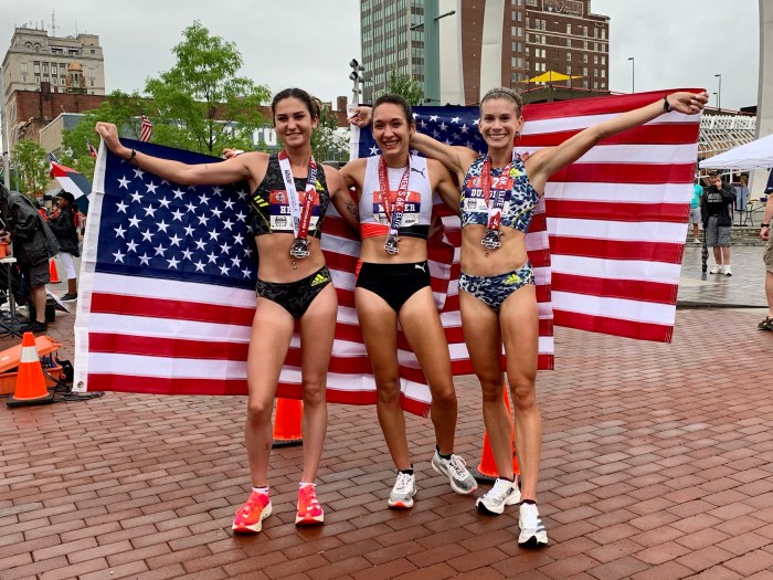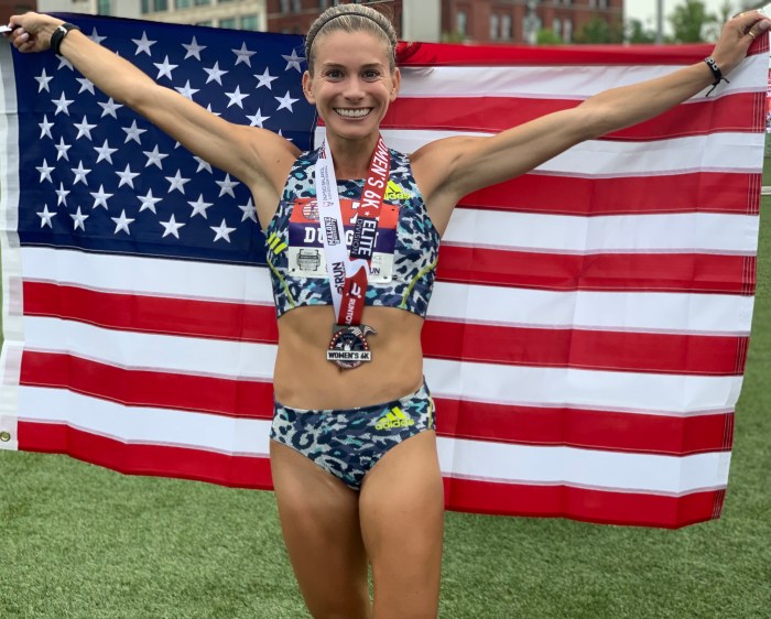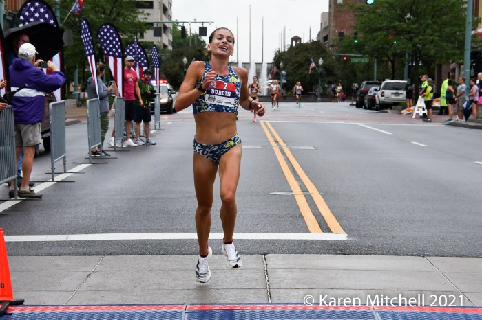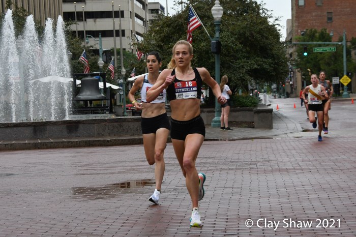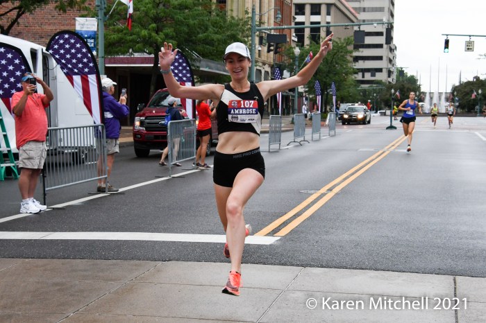 Canton, Ohio, July 17, 2021—Taylor Werner found everything about race day rather perfect. Werner, 23, who runs for the Puma Pro-Team based in Chapel Hill, NC, won in 18:21 over a stellar women’s field. Werner said she enjoys hills and is used to humidity. She broke away from Emily Durgin on the final blocks in downtown Canton. Werner and Durgin, 27, who placed second in 18:27, had separated themselves from the nine-woman lead group, around the three-mile mark. Werner is from Ste. Genevieve, Missouri and ran for the University of Arkansas. Elly Henes of Raleigh, NC was third in 18:35. Henes just turned pro after winning the NCAA 5000-meter championship, representing NC State. Elly’s mom (and NC State coach) Laurie Henes won the title in 1991.