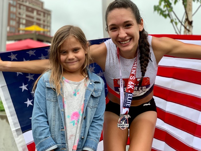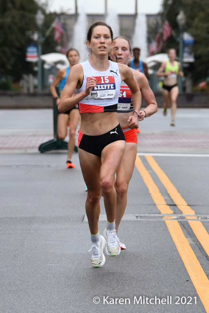 Werner’s Puma teammate, Fiona O’Keeffe of Chapel Hill, NC was fourth in 18:41. Katrina Coogan of Johnson City, TN was fifth in 18:42. The top ten were introduced on stage at the award ceremony, and won prize money. 37 women finished the elite race with all under a six-minute per mile pace. The top three were under five-minute pace.