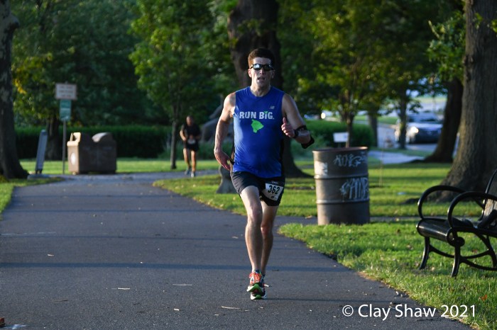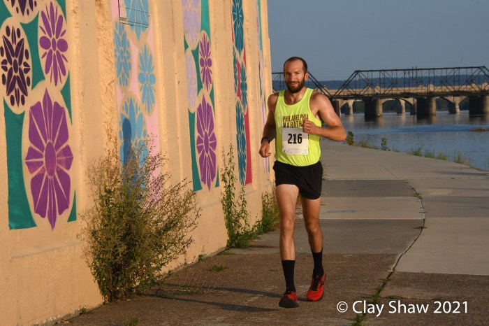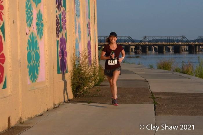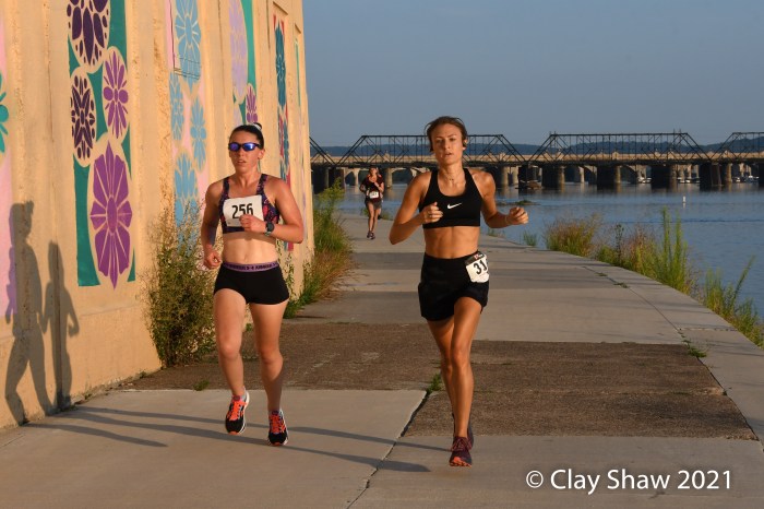 HARRISBURG, PA, August 12, 2021—Fred Joslyn of Boiling Springs won easily in 24:44 in this unusual evening race, organized by the Harrisburg Area Road Runners and directed by Emily Melton. Joslyn won by over three minutes on a course that starts on the upper level on the Greenbelt at Front and State Sts. The 7K has no street crossings, running north on the lower level under the busy Harvey Taylor Bridge. The race finishes back on the upper level near Front and Boas. Travis Luckenbaugh of Camp Hill was second in the men’s division in 27:55. Matthew Sabath was third in 28:04. Wayne Allen was fourth in 28:20. Bradley Yehl of Maytown was fifth in 28:50.