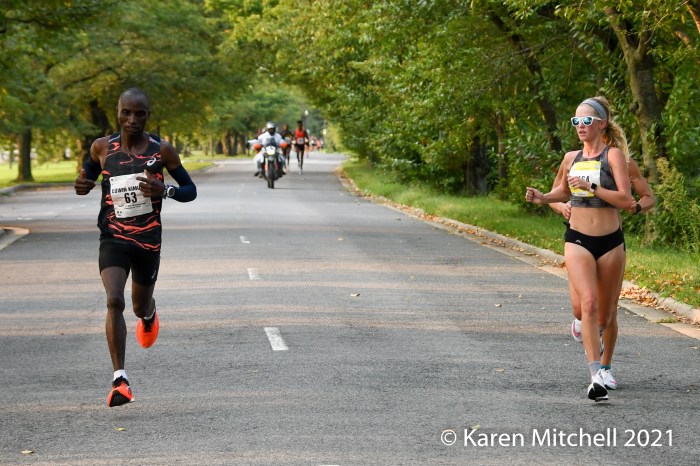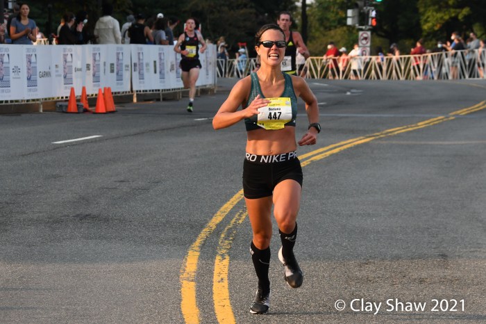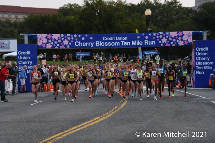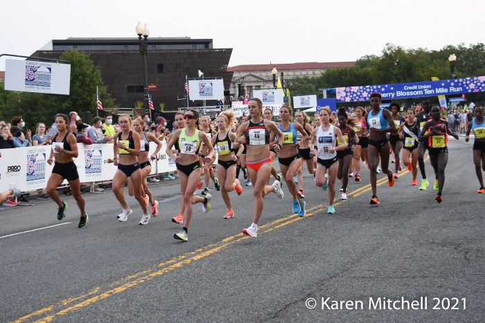 WASHINGTON, DC, SEPTEMBER 12, 2021—Nell Rojas of Boulder, CO used strength, smarts, and power to distance herself from the others in the final turns and ups in the final 500 yards, to win in 52:13. USA track standout Jenny Simpson, also from Boulder, had a great road race debut to finish second in 52:16. Antonina Kwambai of Iten, Kenya was third in 52:23. Kenyan citizen Caroline Rotich of Santa Fe, NM was fourth in 52:25. Annie Frisbie of Minneapolis, MN was fifth in 52:26. The top five were together for over 9.5 miles; it was really an epic race to watch and photograph. The Credit Union Cherry Blossom is usually, of course, in the Spring. Credit goes to the staff, sponsors, and volunteers who made a 2021 race take place in a safe way in the Nation’s Capital.