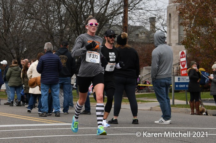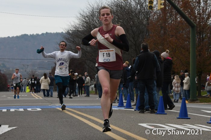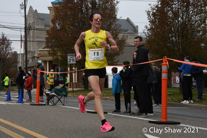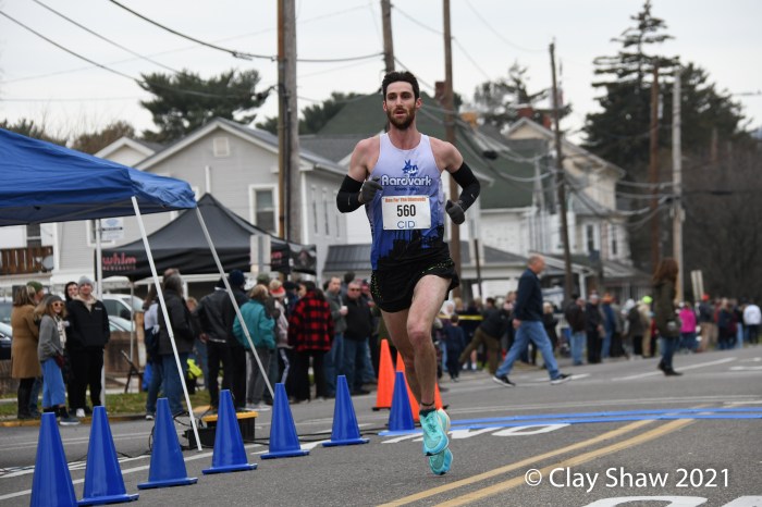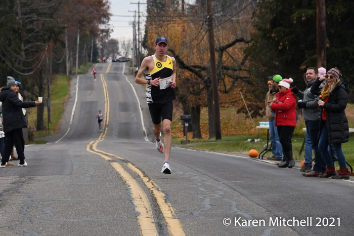 The lanky Gillette—once coached by U.S. Olympian Steve Spence (former Diamonds champ in 1987) at “Ship”—tabulated four straight victories at Berwick from 2015 through 2018, with a previous best time of 45:02. He was out with an injury in 2019 and finished second in 2020. But Matt in the Hat was certainly back and in fast form this Thanksgiving morning.