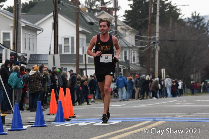 The baseball-capped Gillette shook out his arms occasionally (“I was cold!”) and even glanced back several times to verify that he was holding on to—or expanding—his lead on his closest pursuers (David Haines and Alex Price), but he never felt particularly pressured after pushing to about a 50-meter lead at 5K and at least double that on the sweeping downhill and sharp left turn just past the halfway mark.