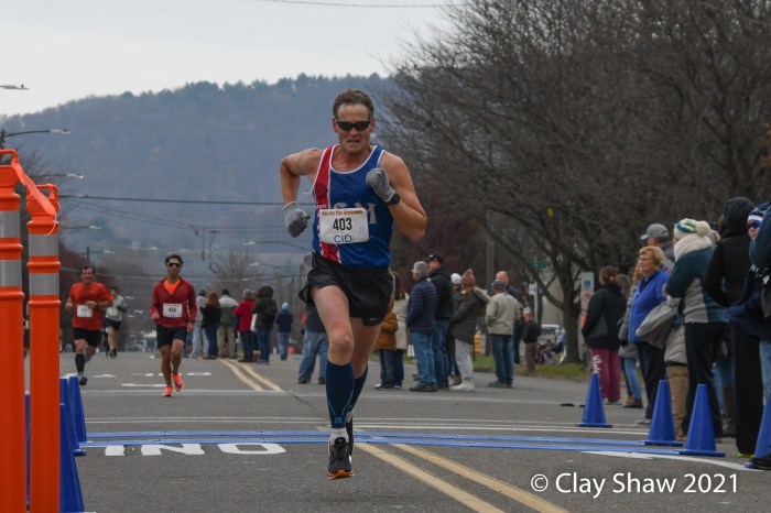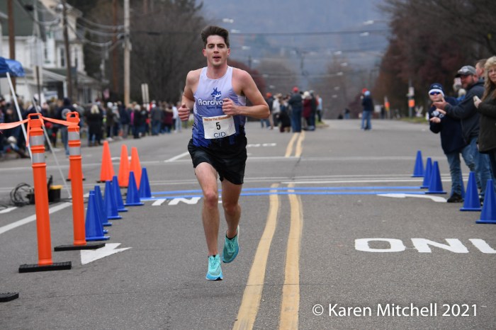 And not a bad wager at all, as Gillette—former Shippensburg University standout from Allentown, PA.—nailed down his fifth all-time victory in Berwick, Pennsylvania’s Turkey Day classic (dating back to 1908!) race. He also notched his career best time—44 minutes, 49.95 seconds—over the rugged route (more than a mile “up” from 2-miles to 5K or a bit beyond), cracking 45-minutes and joining a rather elite corp of runners (several dozen) who have been able to crank sub-5 minute miles around the lasso-shaped layout. (Former U.S. Olympian Pete Pfitzinger still holds the formidable men’s mark of 43 minutes, 21 seconds, established when he won Berwick in 1981.)