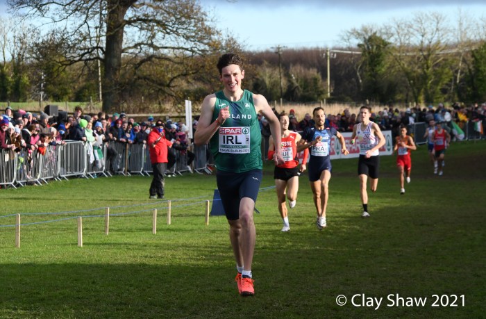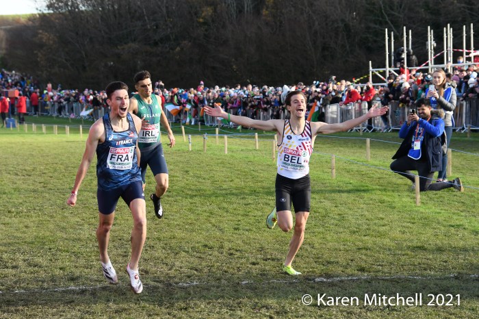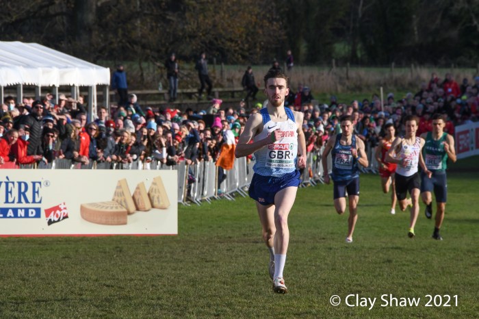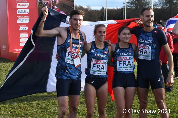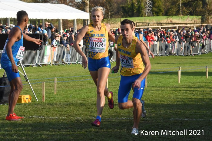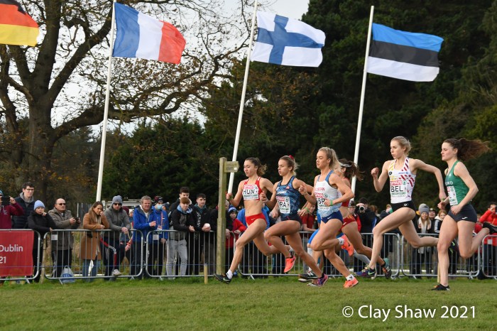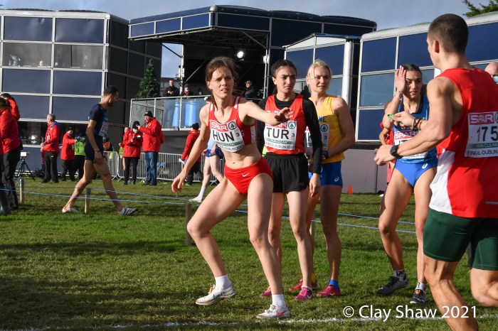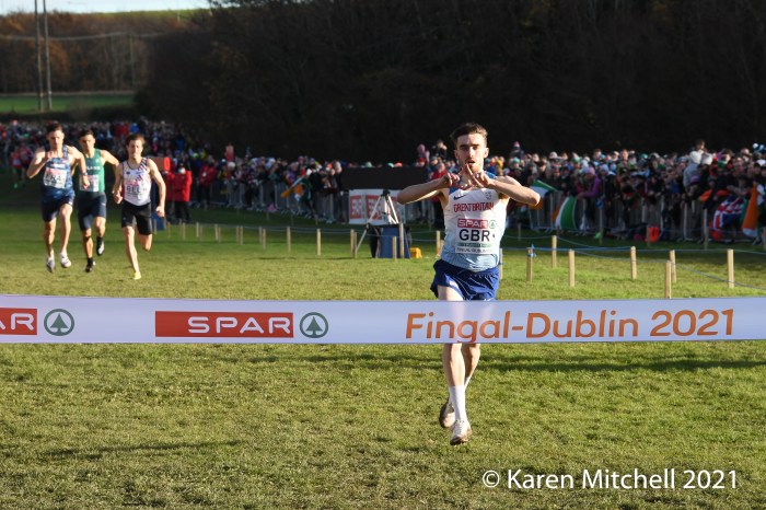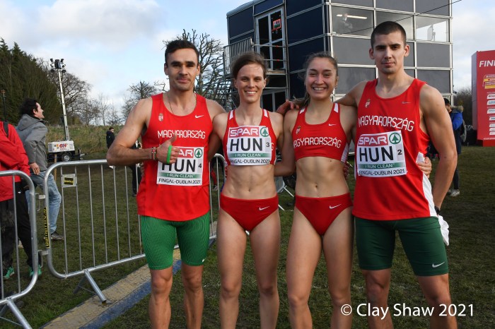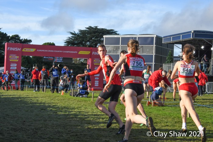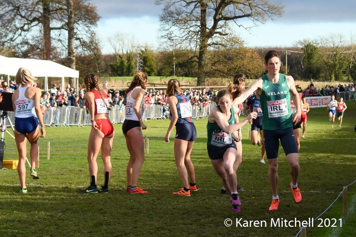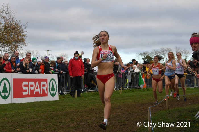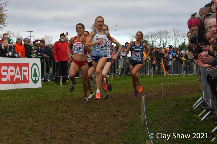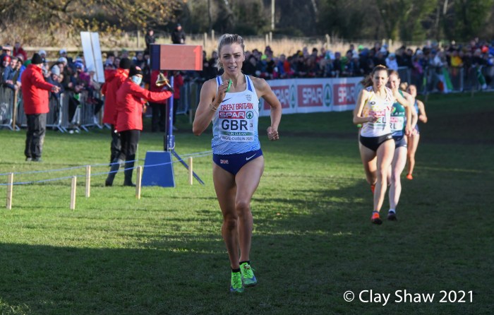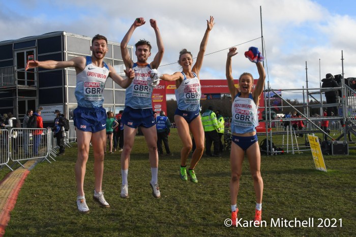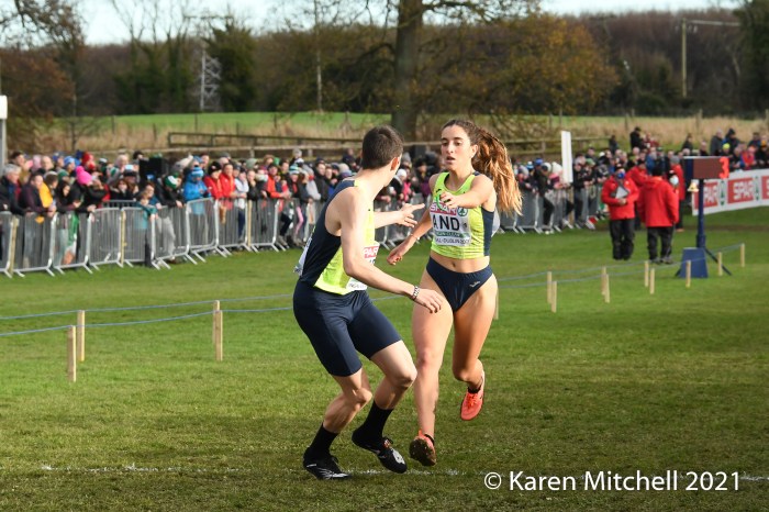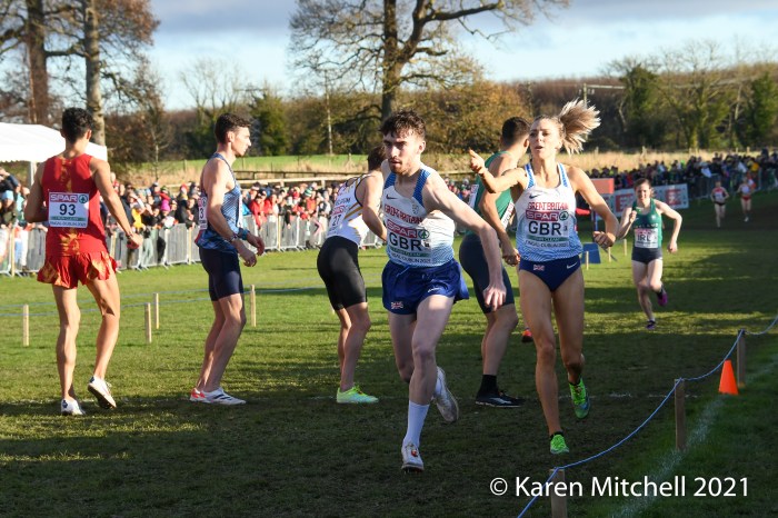 Dublin, Ireland, European Cross Country, Mixed Relay, December 12, 2021—Olympic 800-meter runner Alexandra Bell brought the Great Britain team from seventh to first on the third lap of the mixed relay. Benjamin West took the final lap and had a solid run to take the team title in 18:01. Hannah Nuttall and Luke Duffy ran the first laps, before Bell took ten seconds back on the field in lap three.