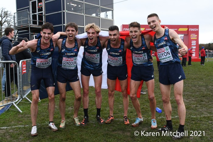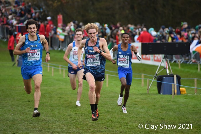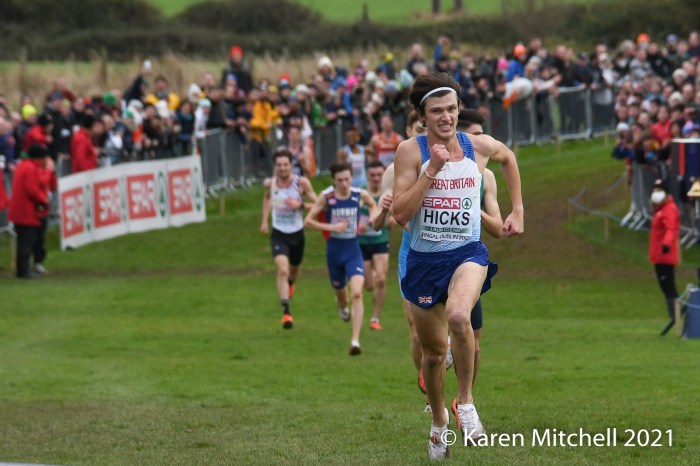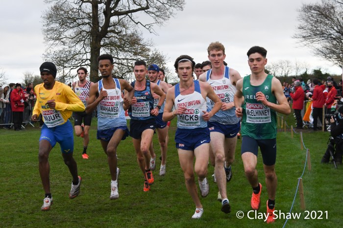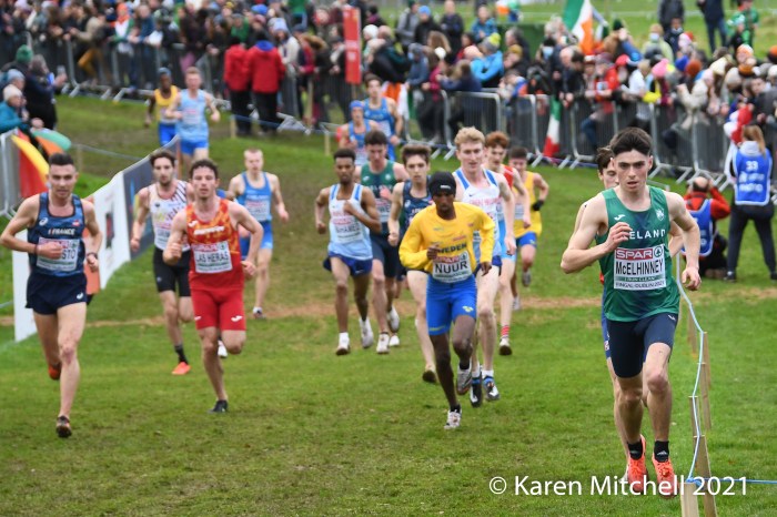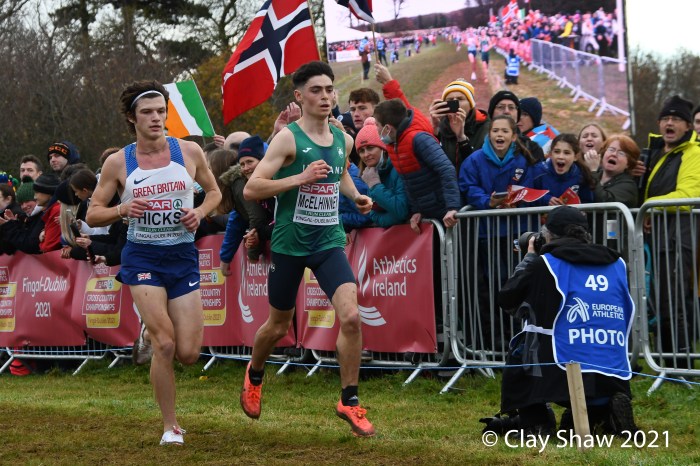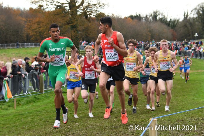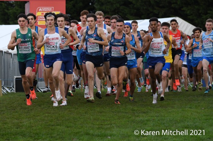 Dublin, Ireland, European Cross Country, U23 Event, December 12, 2021—Charles Hicks of Great Britain & Northern Ireland won in 24:29. Hicks, who runs for Stanford University in Palo Alto, CA, had to withstand a very strong challenge from Darragh McElhanney of Ireland who took the lead on the next to the last lap, thrilling the home crowd. McElhinney took the silver in 24:33 on the 8000-meter course. The Irish won the team title, led by McElhinney, Keelan Kilrehill who was sixth in 24:42, and Michael Power who was thirteenth in 25:03.