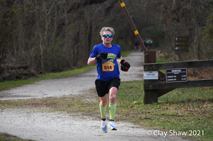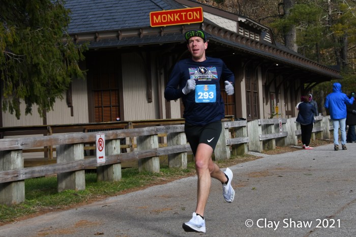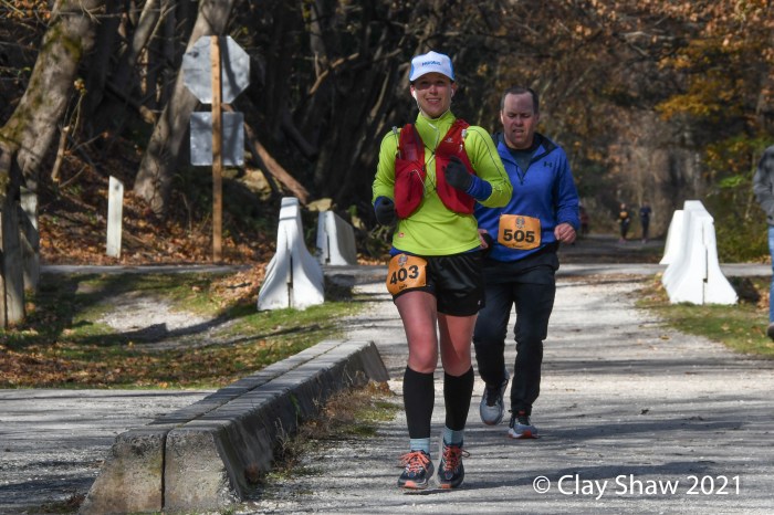 The top marathon runners were chasing after the event records, men’s from 1995 by two-time winner Robert Marino of Annapolis, MD (2:25:18). Women’s was from 1998 by Joanna Zeiger of Baltimore (2:47:25). No other female had run under 2:50 in the history of the race, and only five other women had been under three hours. The master’s records are held by William Desmond of Baltimore, MD, 1991 (2:36:03) and Barbara Bellows of Ithaca, NY, 1996 (3:04:02).